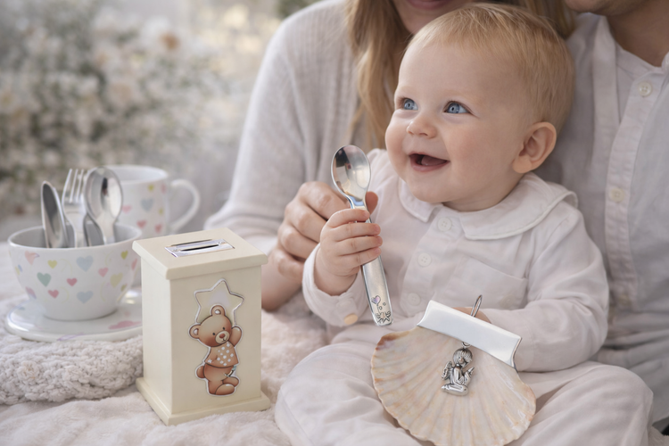 Set de cuatro cubiertos en acero lisos brillo y marco osito en plata en tonos beige. Medida del marco 10*15. Set de 4 cubiertos de acero inoxidable con acabado brillo, acompañados de un marco decorativo en plata con un adorable osito. Perfecto para los...