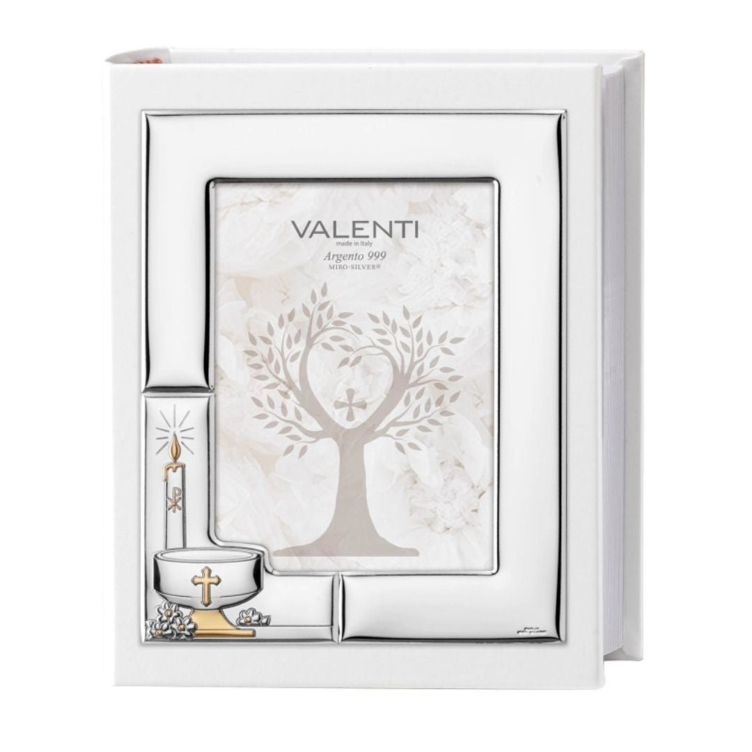Beautiful christening photo album with a frame decorated with a candle, a baptismal font, and little flowers in shiny silver and gold. It measures 20*25cm with a white exterior and a 13*18cm photo frame to display your little one's photo.