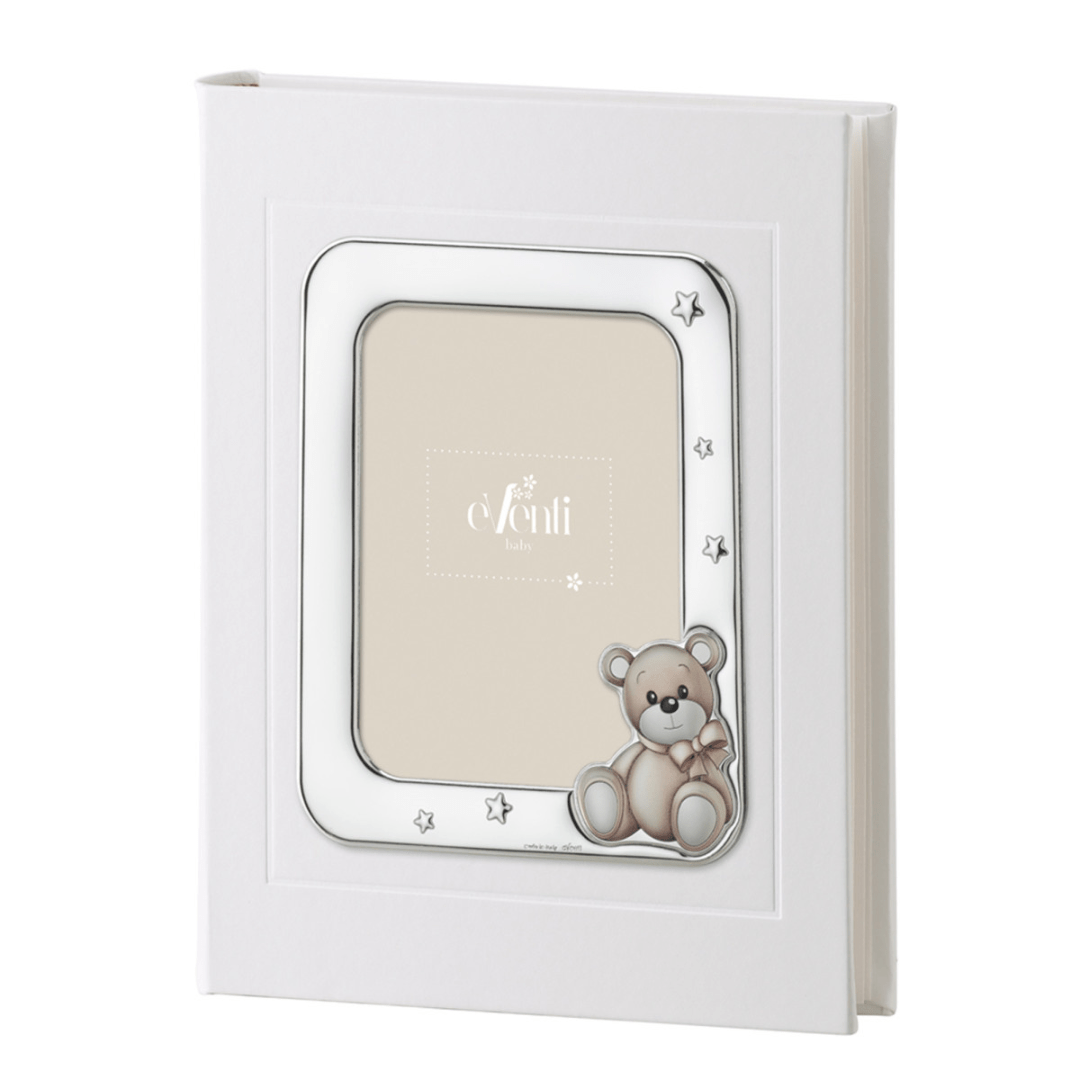 Lovely and sweet teddy bear photo album with a silver bow and white and beige enamel decorated with little stars. It measures 20 x 25 cm with a white exterior and a photo frame to put your little one's photo in.