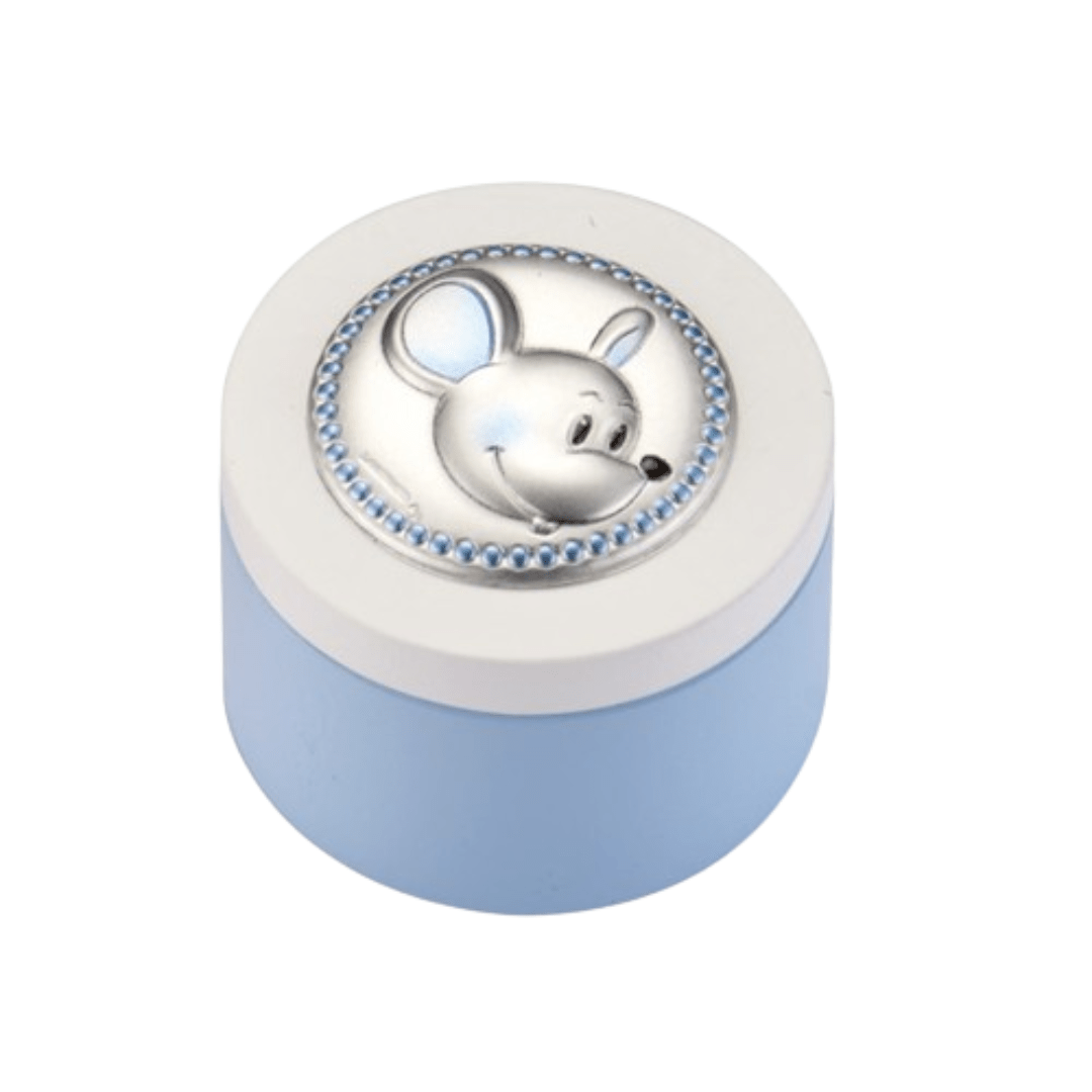 Lovely and sweet little wooden and silver box "Ratoncito Pérez" in blue and white tones with a picture of a mouse with blue enamels. It measures 5cm in diameter.