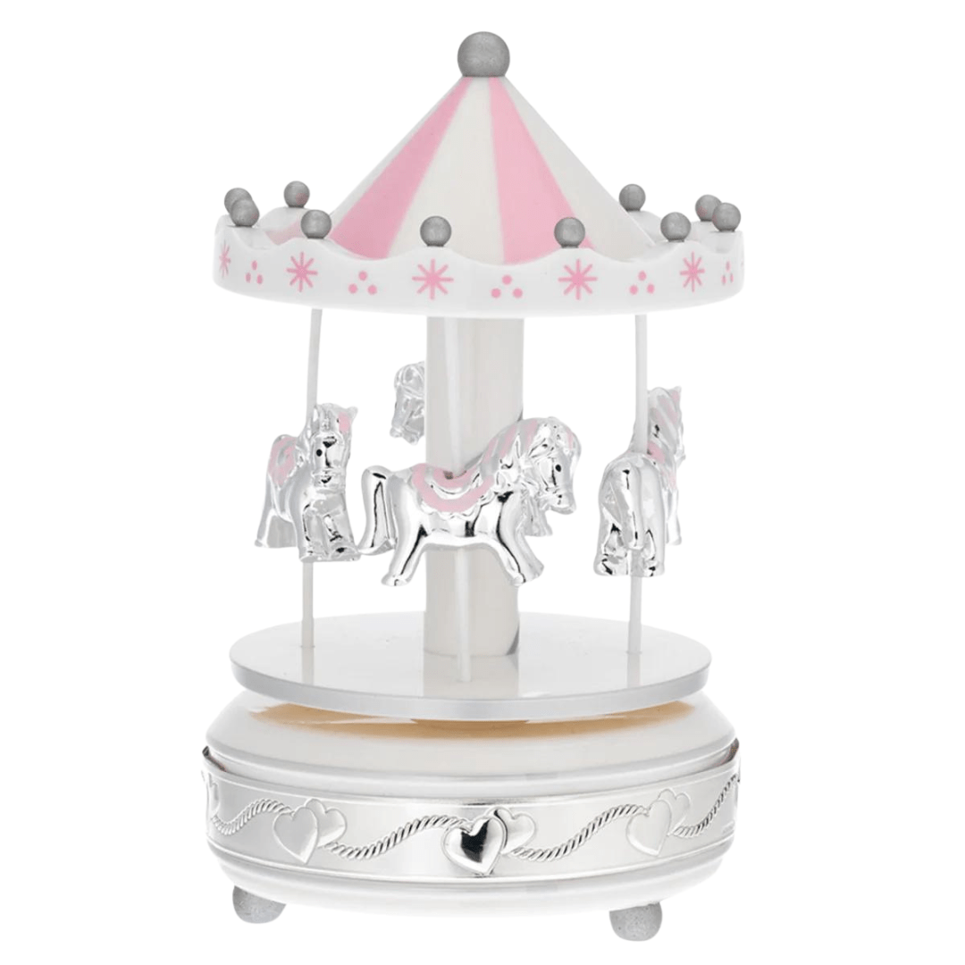 Lovely and sweet pink musical carousel with hearts decorated with matte and shiny silver. Measures 10x18 cm. When wound up, it plays a sweet melody. Lovely company for your baby's room.