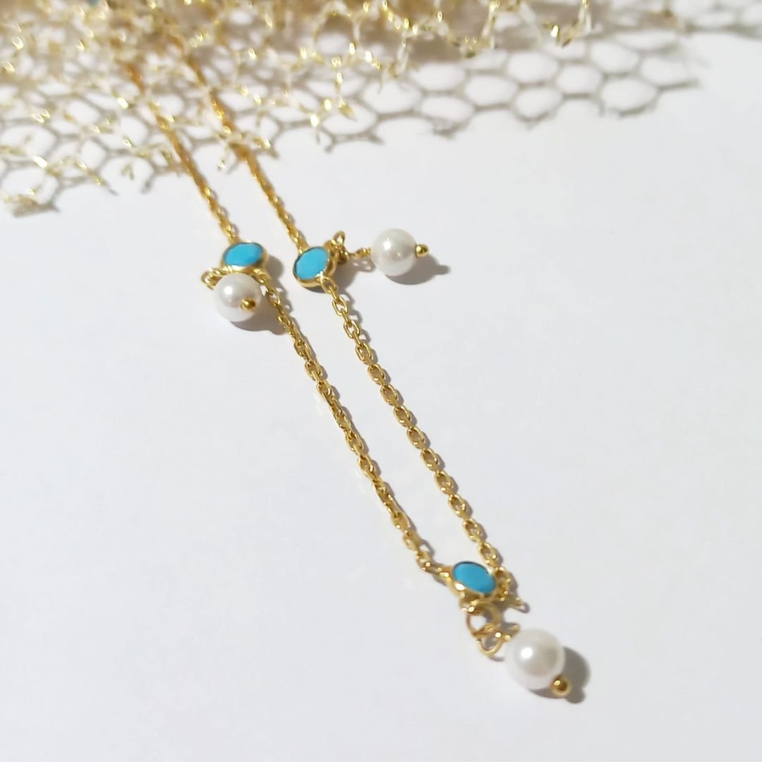 925mm sterling silver choker plated in 18 carat gold, with five hanging pearls and five round turquoises, 40cm forxat chain extendable up to 43cm. Spring ring clasp. Beautiful pearl and turquoise choker for mommy.
