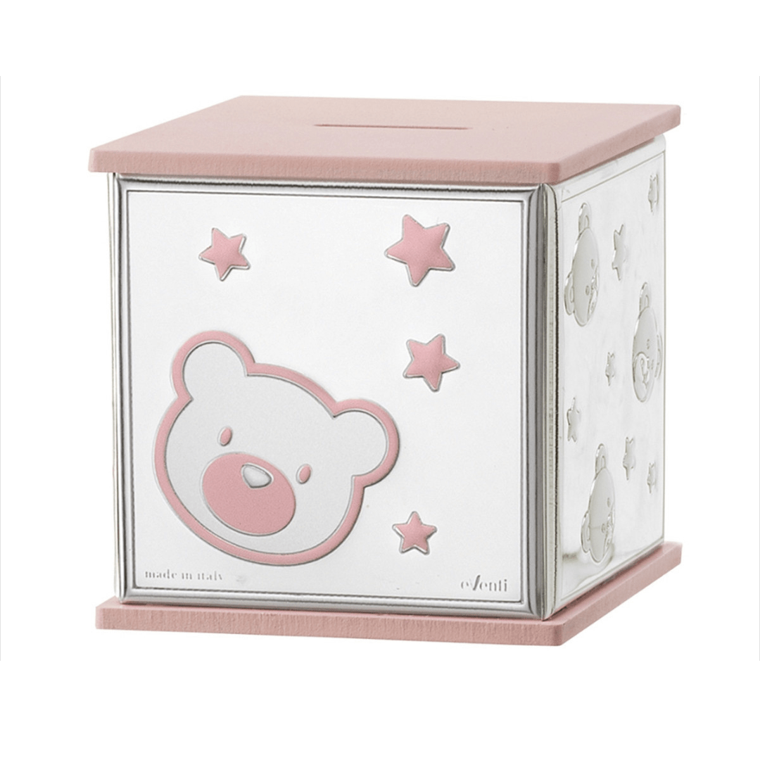 Lovely and sweet silver cube-shaped piggy bank with a bear face and stars with baby pink enamel. It measures 9*9 cm and is lined in silver with bear face and star decorations and pink wood.