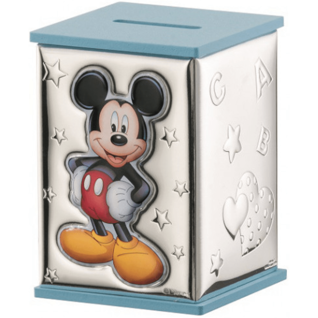 Beautiful silver piggy bank from the Disney Mickey Mouse collection, enameled in red, black, and gold, accompanied by hearts and letters. Measures 8x12 cm. Made of blue wood. It's an ideal gift for your baby's first savings.