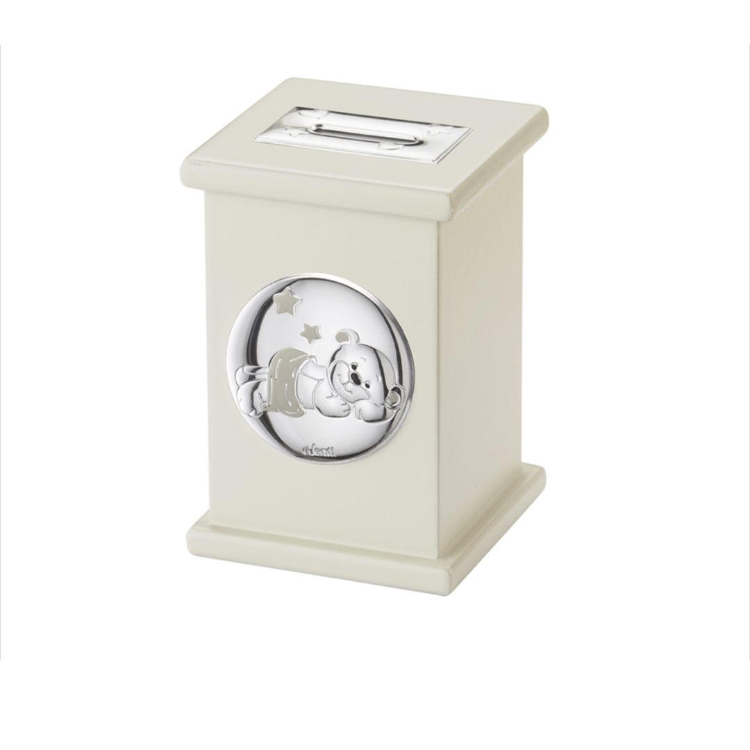 Lovely and sweet sleeping bear piggy bank with blanket, in silver and white enamel. It is musical. It measures 8x12 cm and is made of beige-white wood. Sweet musical piggy bank for your little one's first savings.