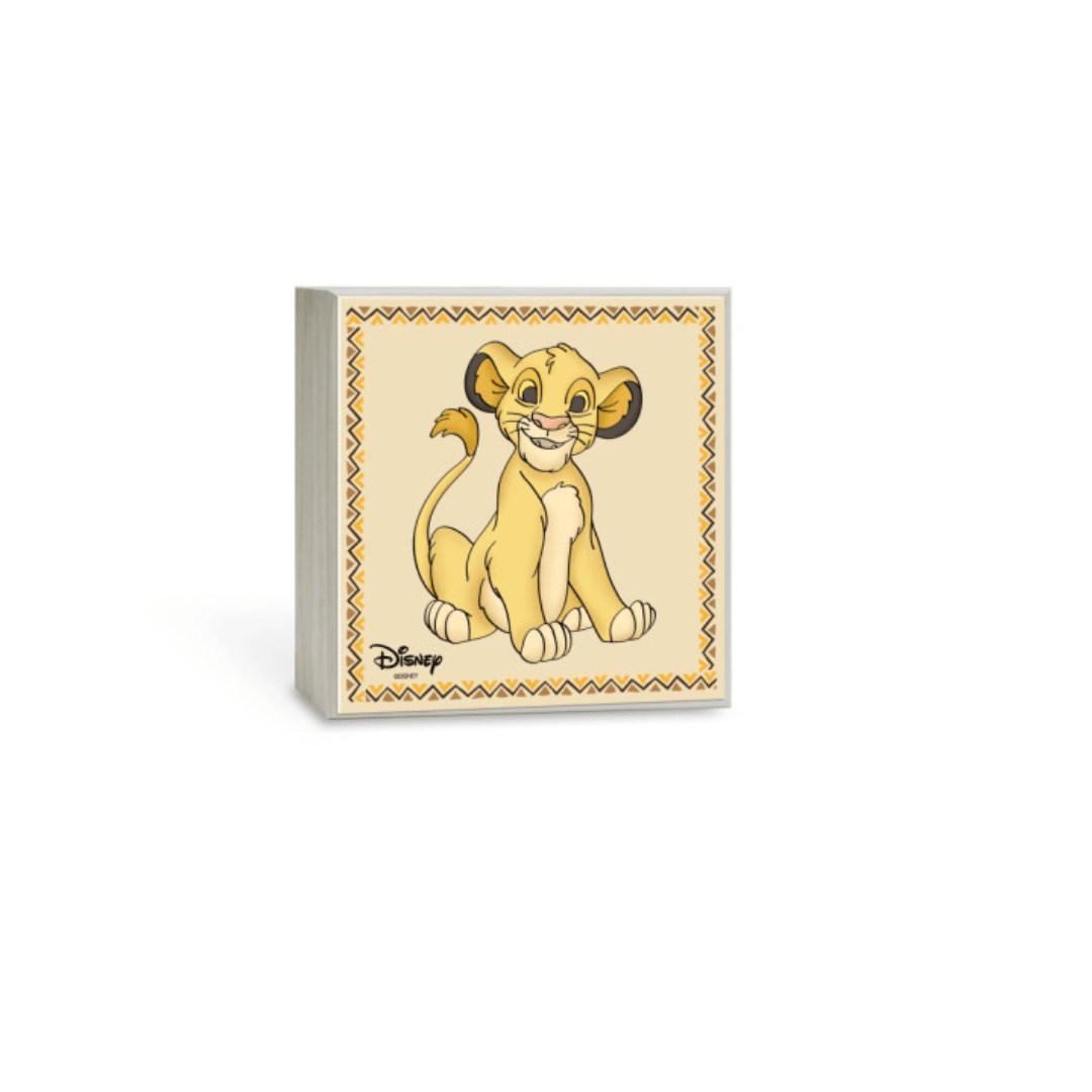 White and beige wooden Lion King lamp with LED lights, ideal for a baby's room. It measures 14 x 14 cm and creates a sweet and cozy atmosphere.