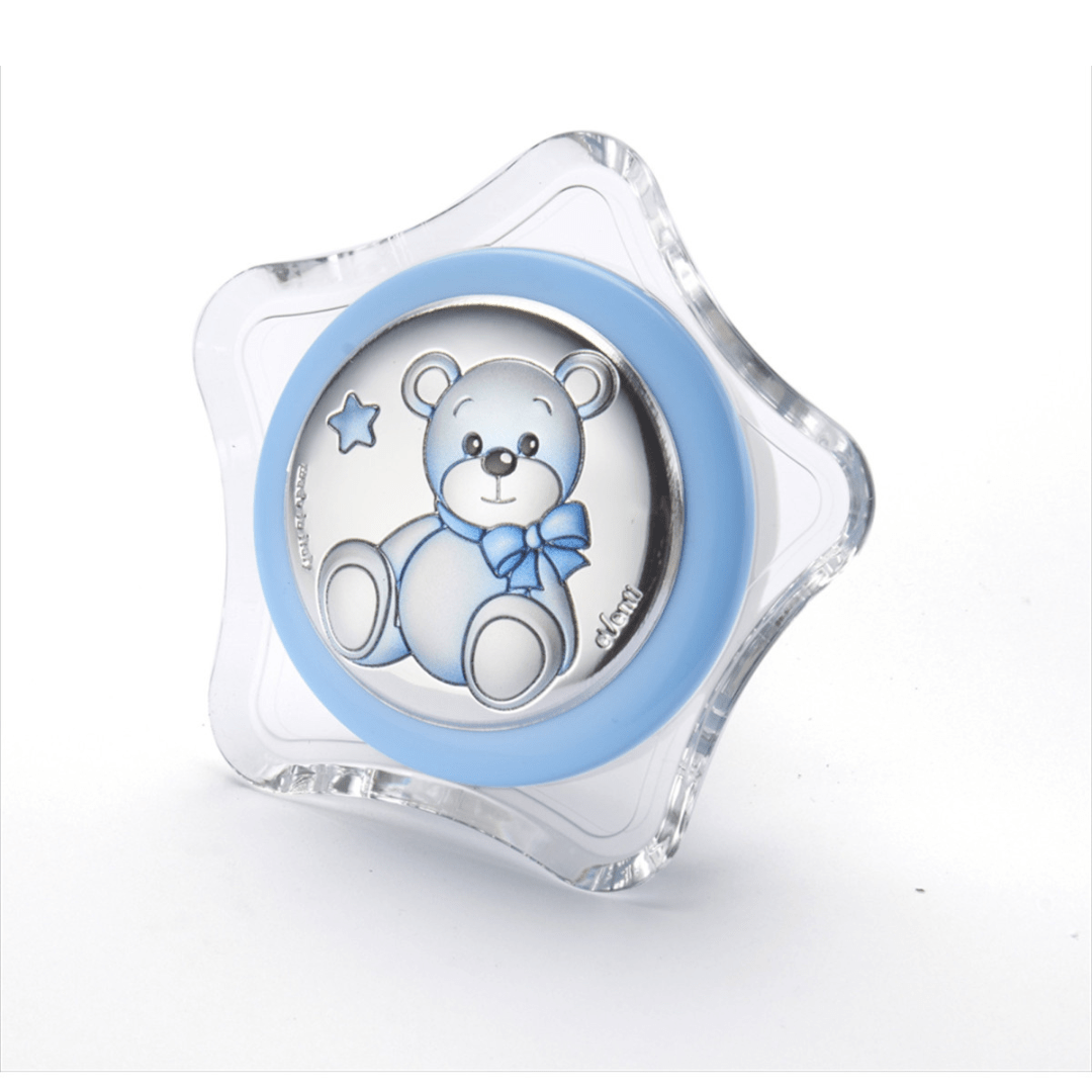 Silver light point with a teddy bear with a bow and a star with blue enamel. When plugged in, a little light turns on to accompany your baby's nights. Measures 9*9cm.