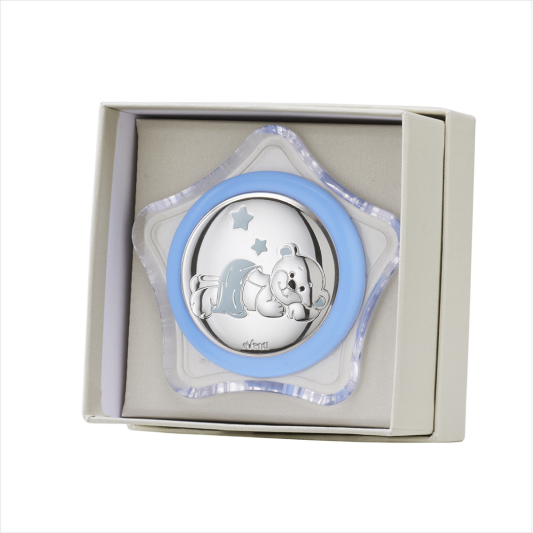 Silver teddy bear light with a blanket and blue enamel stars. When plugged in, a little light comes on to keep your baby company at night. Measures 9 x 9 cm.