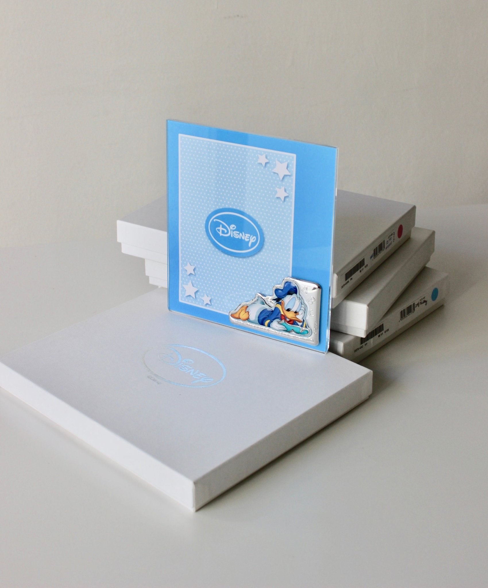 Silver Donald Duck frame from the Disney collection. Made of plexi material, Donald Duck reader with enamels in blue and green, decorated with alphabet. Measures 15x20 cm. Beautiful plexi and silver frame for that special photo, which will decorate your baby's room.