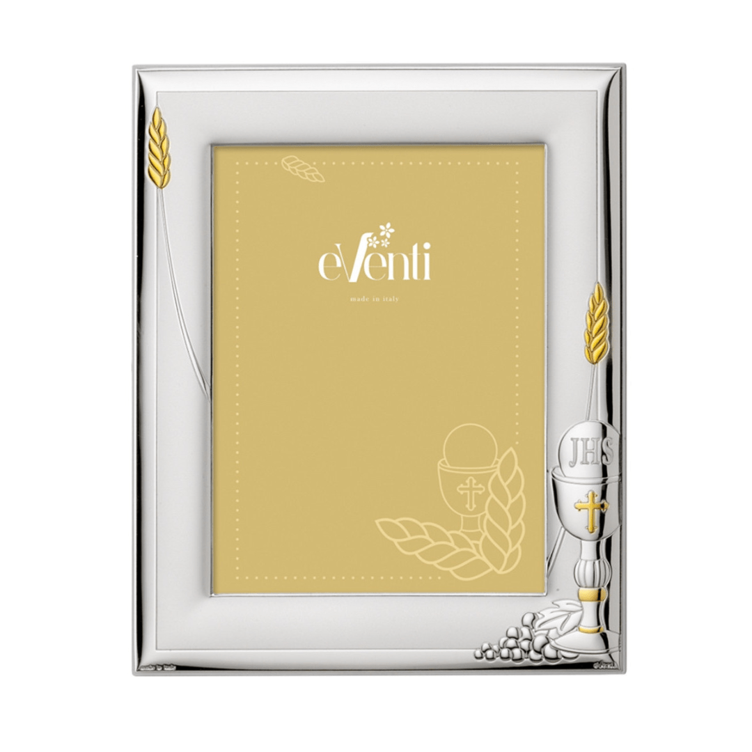 Silver frame for first communion with a glossy finish decorated with ears of wheat, a chalice and grapes in matte gloss and gold. Measures 15*20 cm