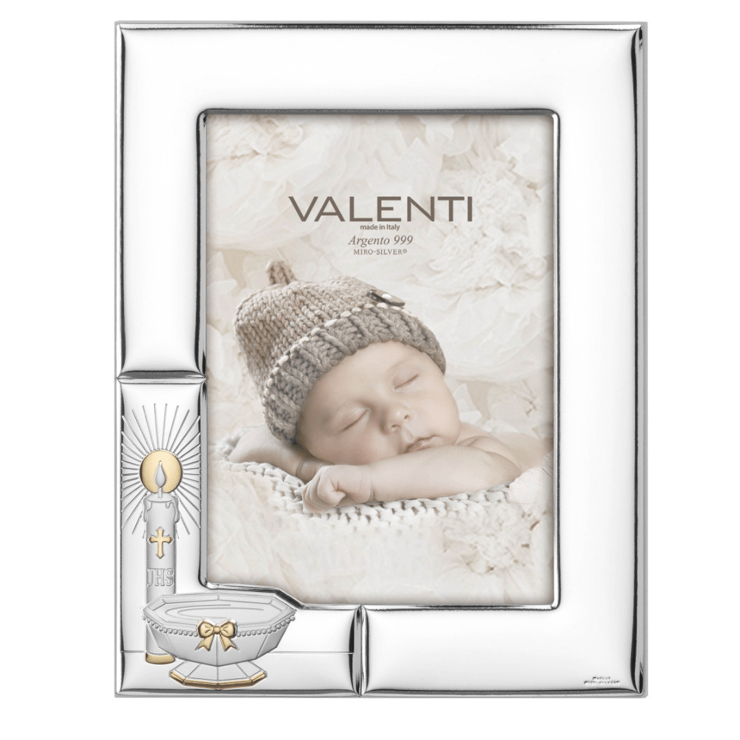 Silver frame for baptism with a shiny finish decorated with a candle and a baptismal font in matte gloss and gold. Measures 13*18cm