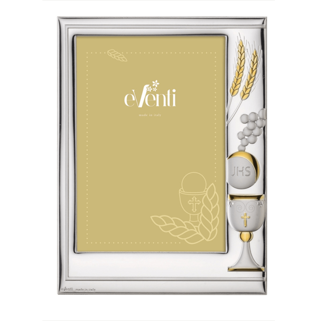 Silver frame for first communion with a glossy finish decorated with ears of wheat, a chalice and grapes in matte gloss and gold. Measures 13*18 cm