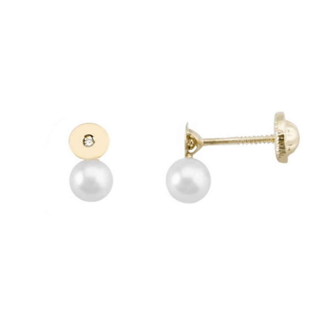 18-karat (750mm) yellow gold round-shaped baby earrings with a 1.1mm 0.014 ct brilliant and a 3mm mini cultured pearl. Screw closure.