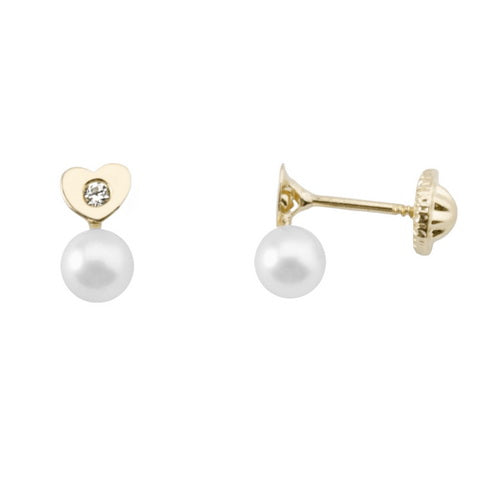 18K gold earrings with 4mm cultured pearl and heart with zirconia. Screw closure.