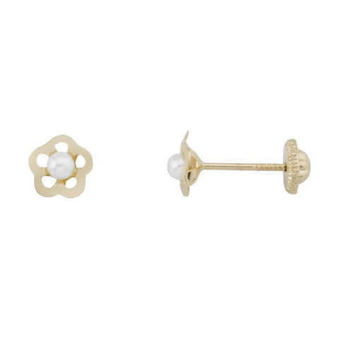 Complete your little one's look with these cute flower-shaped gold earrings with a 3mm mini cultured pearl. Perfect for giving as a gift and making her look gorgeous. Make her look even more beautiful!