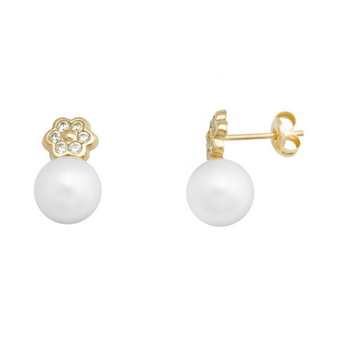 18K gold earrings with flower with zircons and 6.5mm cultured river pearl. Pressure closure.