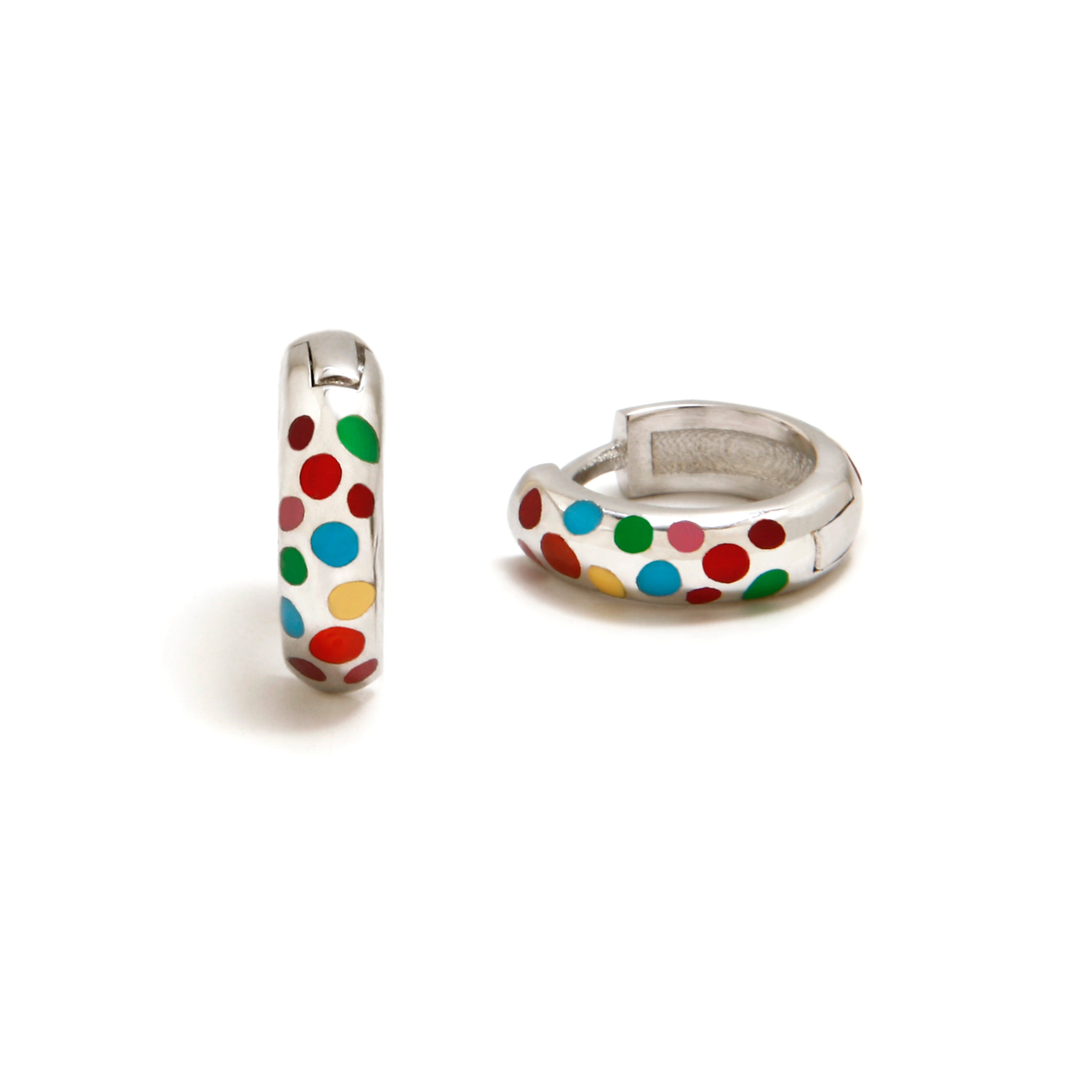 Agatha Ruiz de la Prada 925 mm rhodium-plated sterling silver earrings with a 12 mm domed hoop with multicoloured enamel dots. Pressure hoop closure.