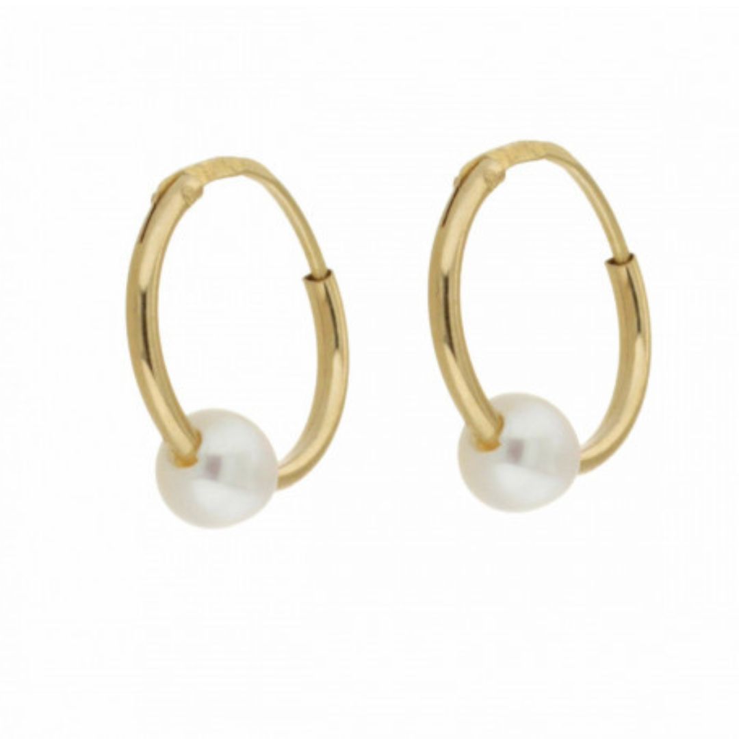 18 karat yellow gold earrings (750 mm), 13.50 mm and 0.85 mm smooth round shiny gold hoop with pearl. Double use with and without pearl. Spring clasp.
