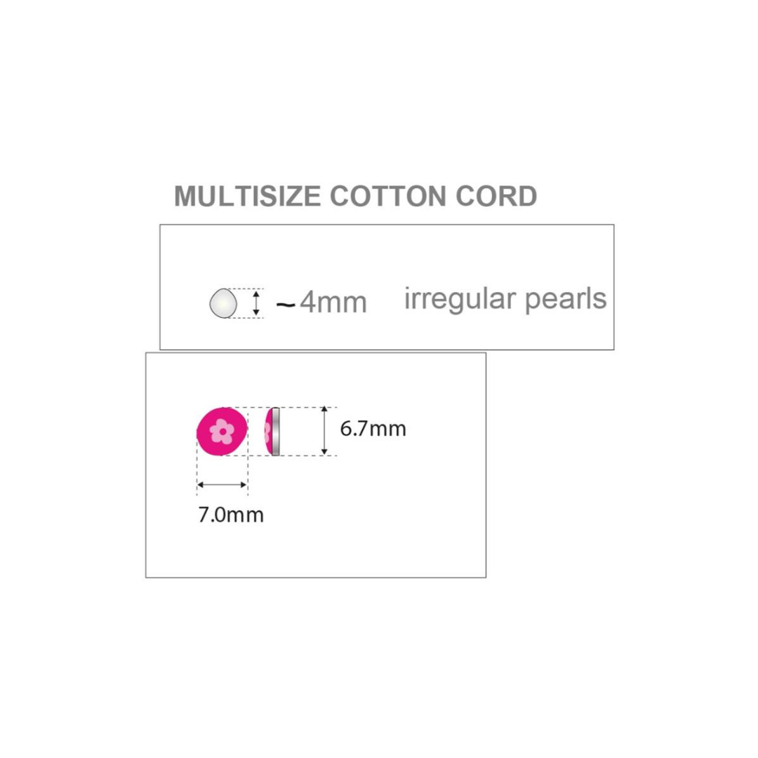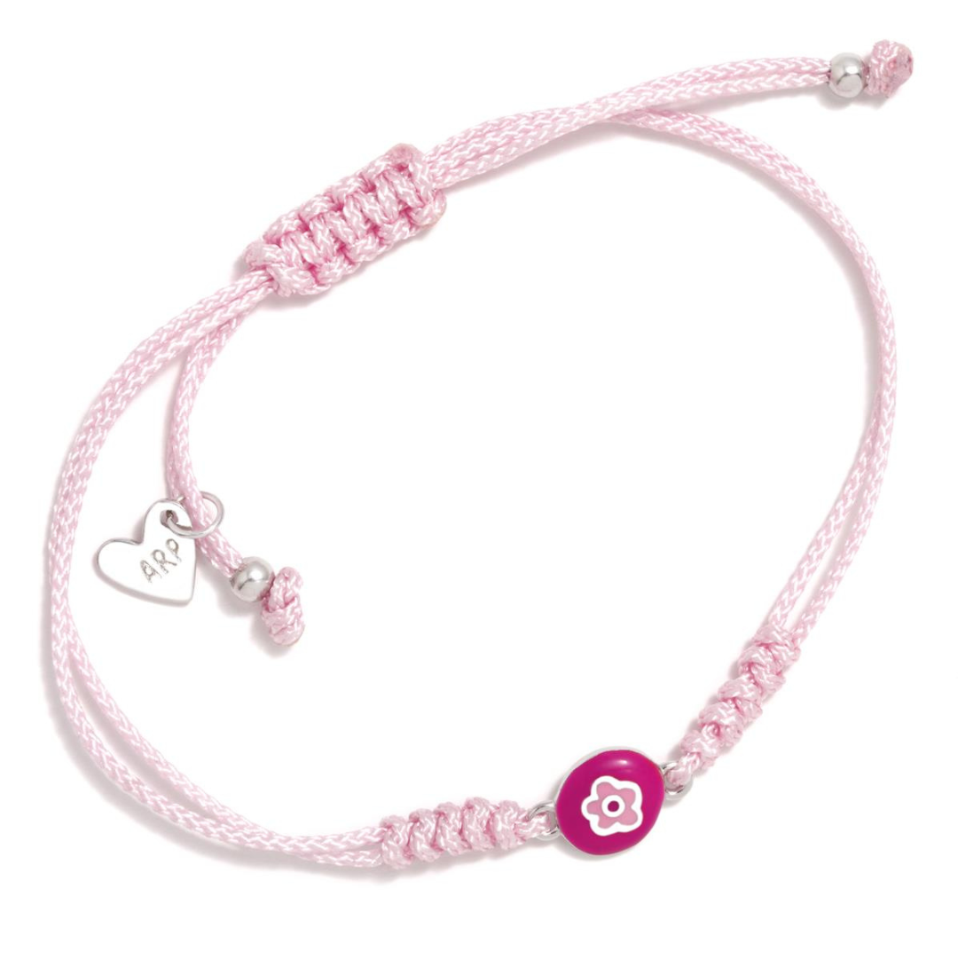 925mm rhodium-plated sterling silver bracelet from the Funny collection, with baby pink macramé cotton thread and silver and enamel decoration with pink and fuchsia flowers. Adaptable to all sizes, with a sliding knot.