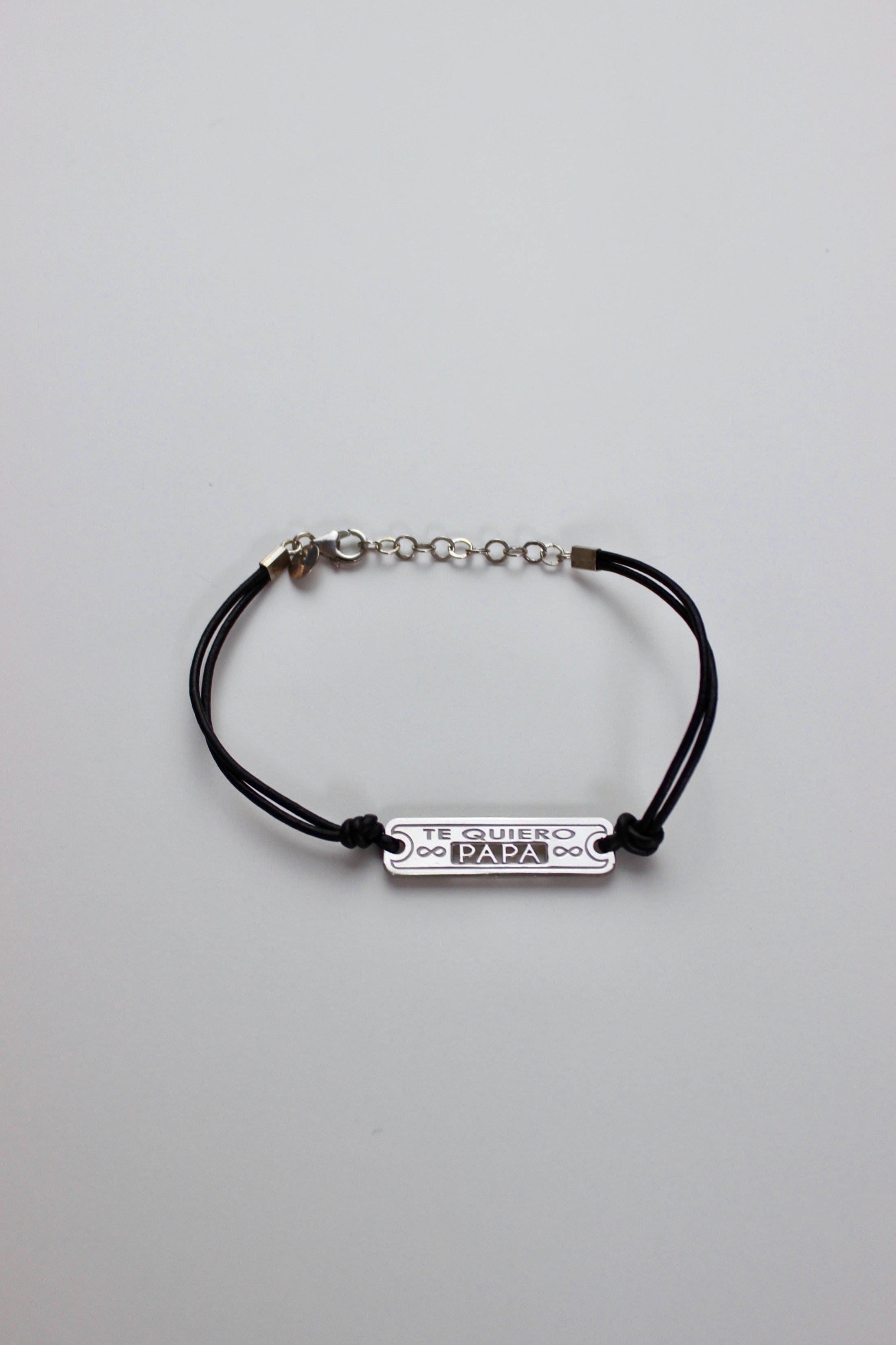 Dad silver bracelet "I love you Dad" with matte and shiny silver plate measuring 37*10mm and 0.8mm thick and double leather-skin bracelet in black. Measures 20 cm. Lobster clasp with 925 silver extension.