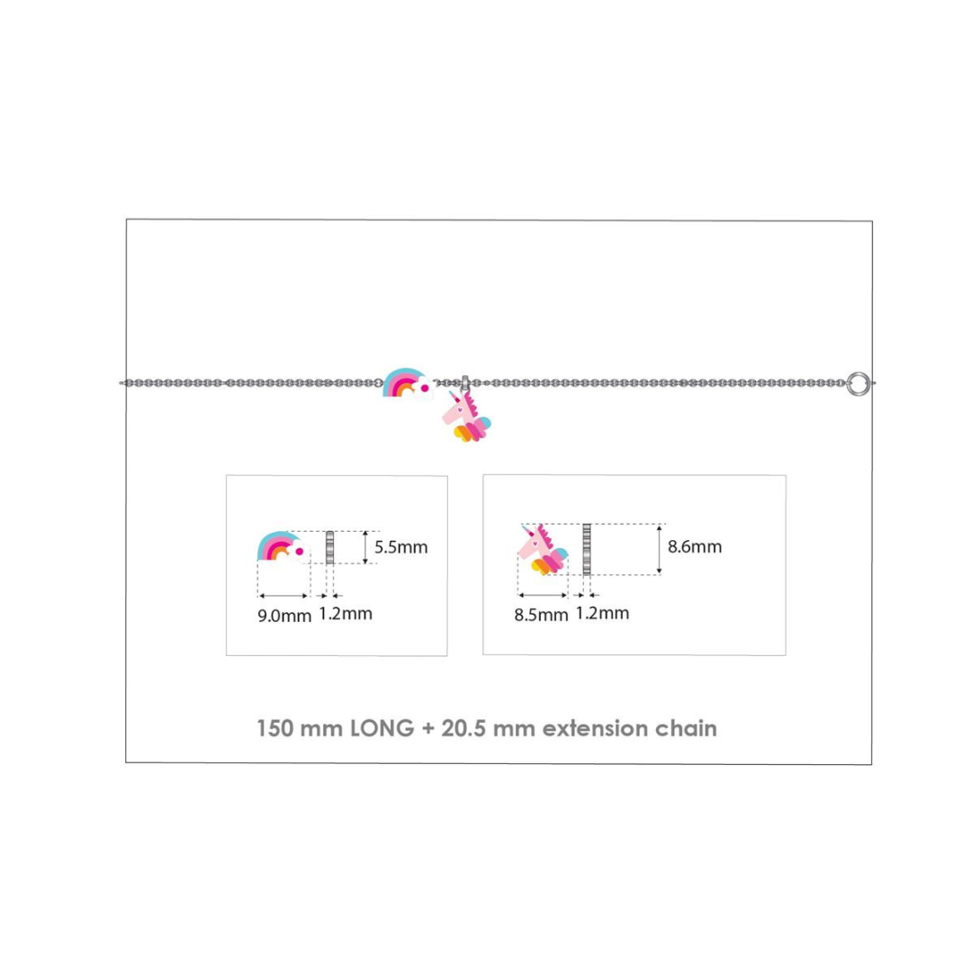 925mm rhodium plated sterling silver bracelet from the Arcoiris collection, enamelled with a multicoloured rainbow and white flower and a multicoloured unicorn pendant in pink, blue, yellow and fuchsia. Forged mesh at 14cm and extendable in 2 positions at 18cm. It has a spring ring clasp.