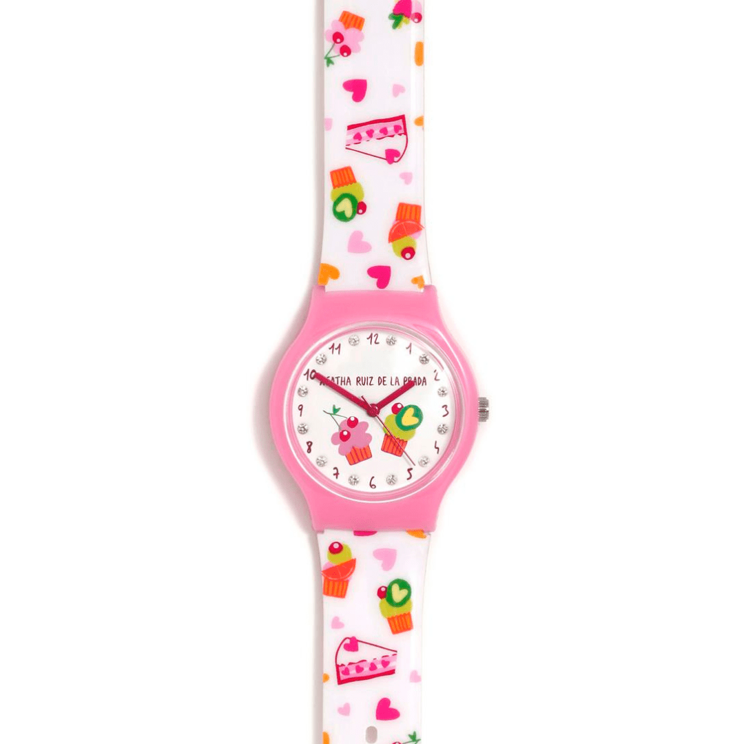 Fun Agatha Ruiz de la Prada watch from the Flip collection with a fuchsia case and fuchsia PVC strap with rainbows, hearts, bunnies... White dial with fuchsia numbers. Japanese Seiko movement.