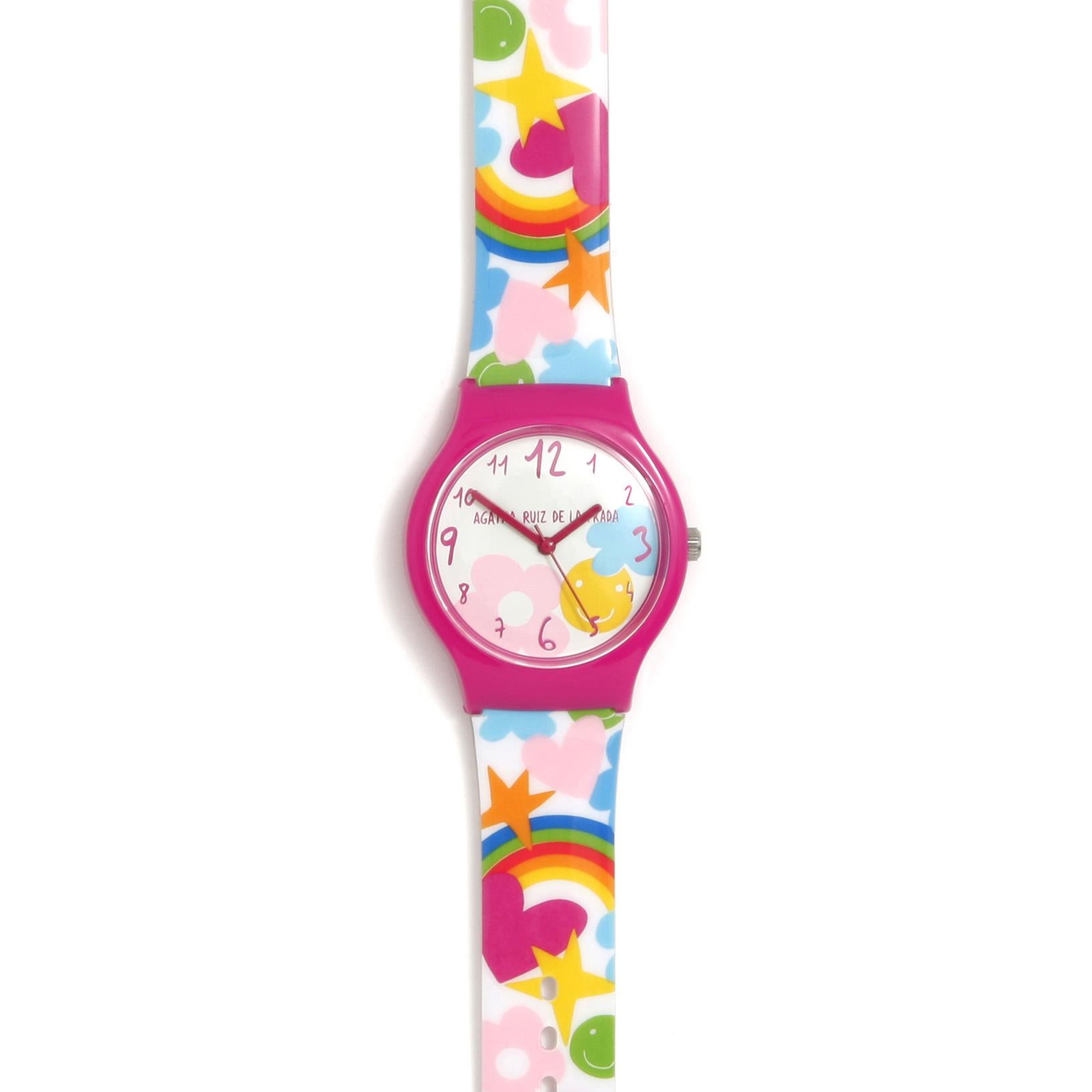 Fun Agatha Ruiz de la Prada watch from the Flip collection with a fuchsia case and PVC strap featuring fun designs, including hearts, clouds, stars, and a multicolored rainbow. White dial with a flower, a multicolored cloud, and fuchsia numbers. Japanese Seiko movement.