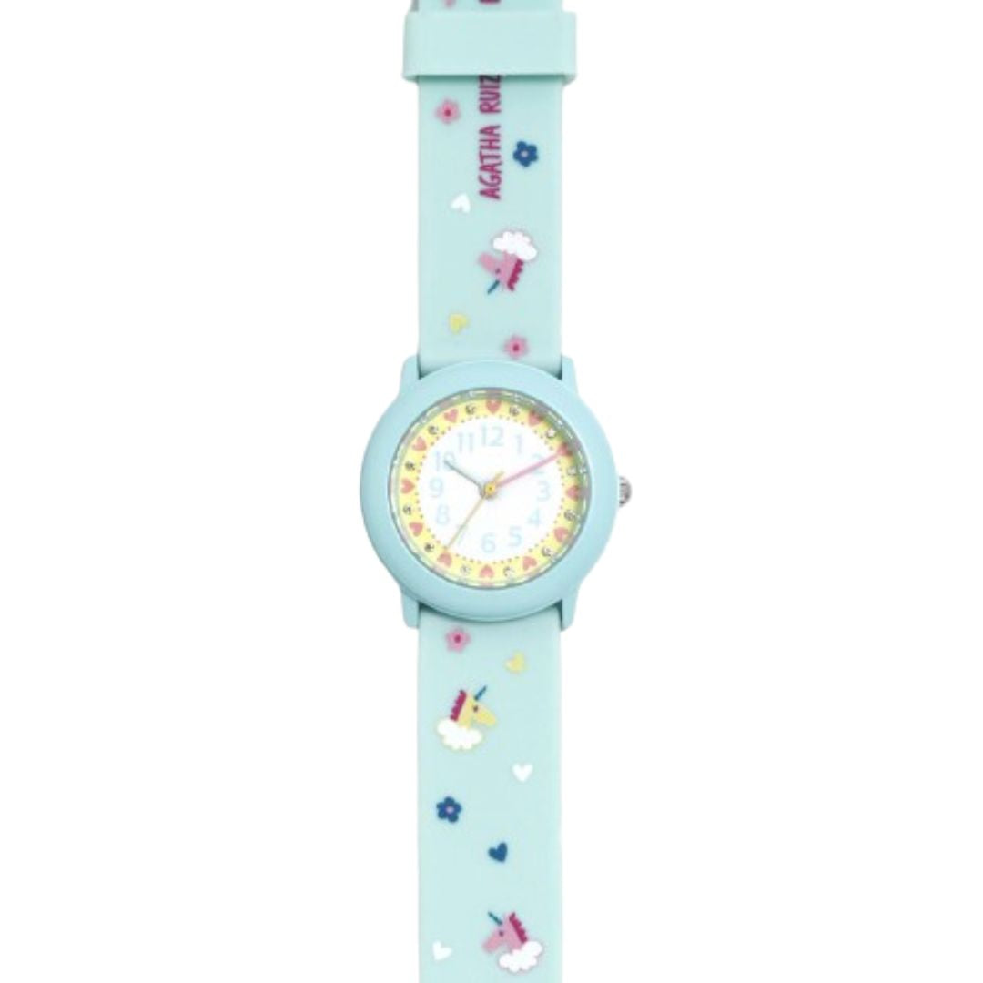 Watch with alloy case painted with hearts, white background and blue numbers, dial with stones and blue silicone strap printed with fun figures such as flowers, hearts and unicorns.