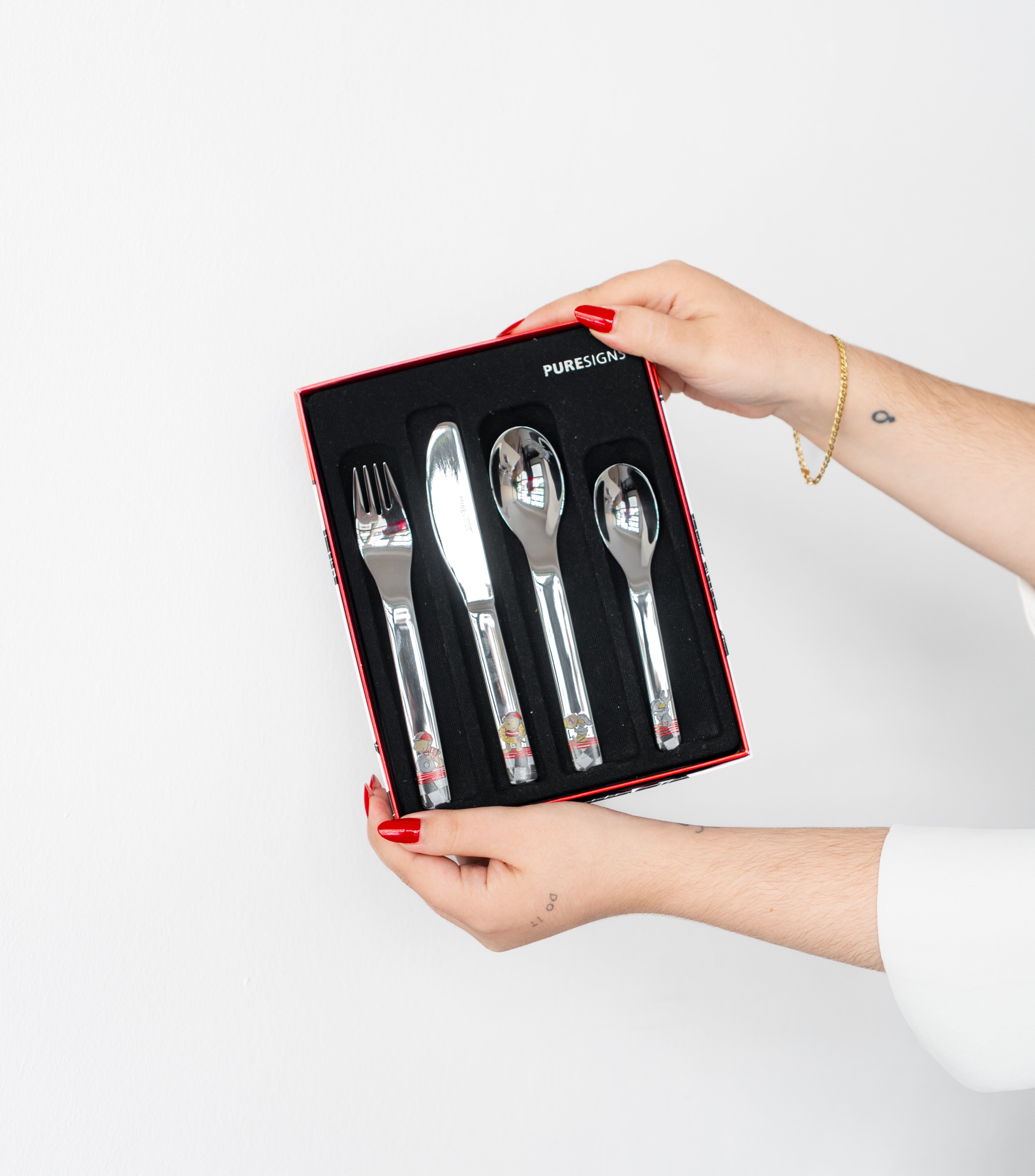 Set of four steel cutlery with enamelled drawings of Quick with his faithful companion Ducky. Porridge spoon, spoon, fork and knife. Cased and personalised.