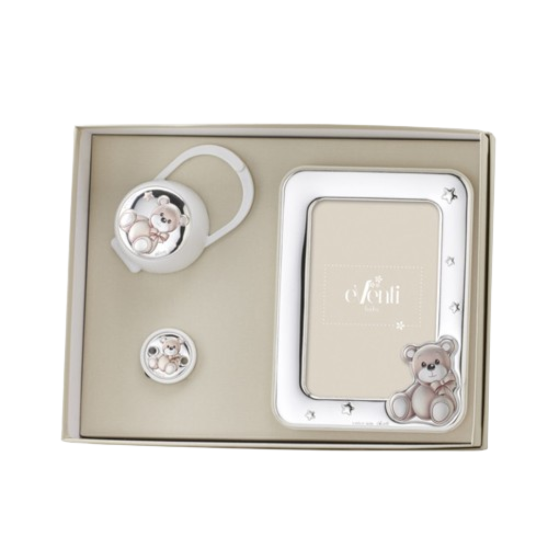 If you love teddy bears, this silver frame set with pacifier clip and pacifier holder is the ideal gift for a newborn baby. With a cute and sweet design, it is perfect for keeping pacifiers organized and always at hand. A practical and charming accessory for any mother.