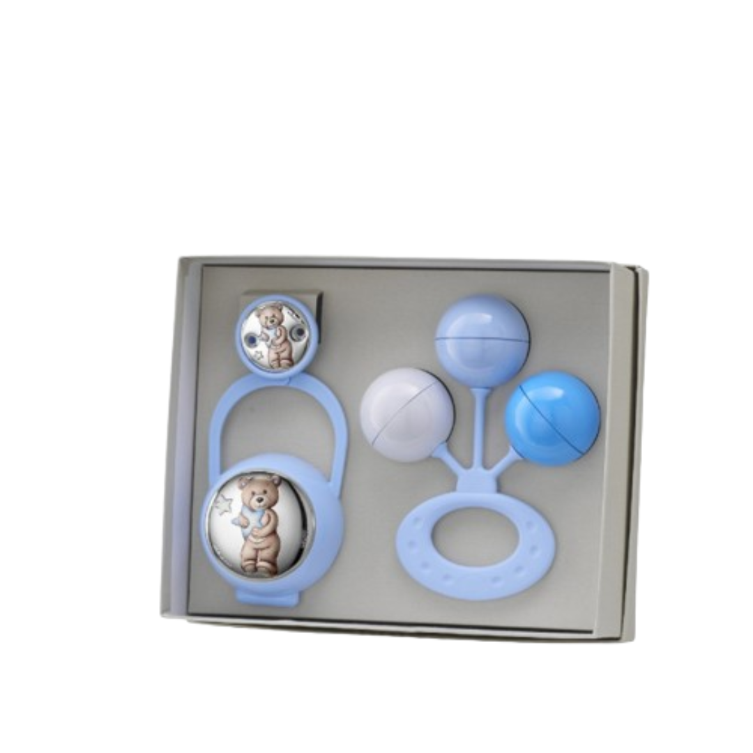 Set of rattle, pacifier clip with chain and teddy bear pacifier holder in silver with beige and baby blue stars.