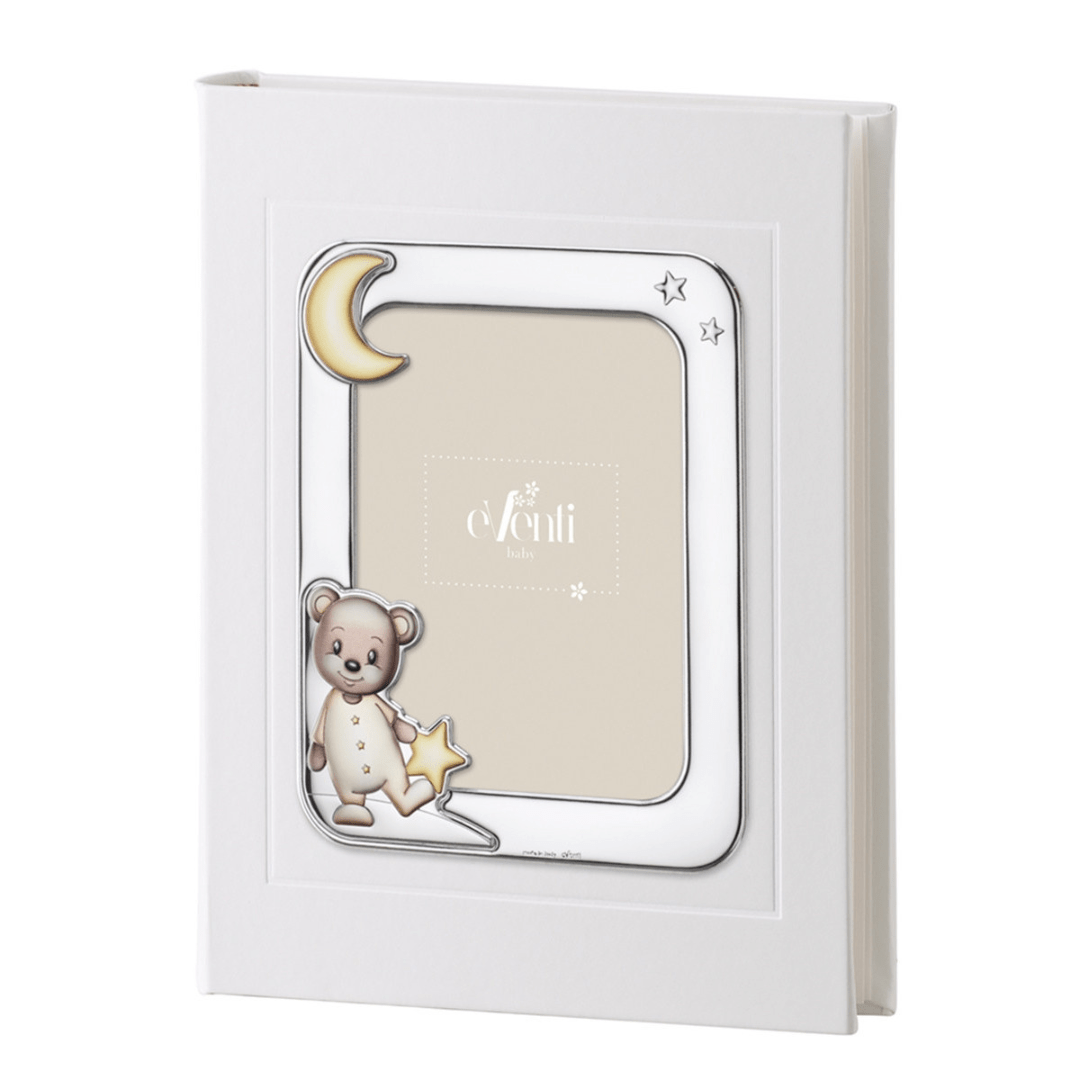 Precioso y dulce álbum de fotos de osito con pijama y estrella en tonos beige y dorado con estrellitas y luna. Su medida es de 20*25cm con exterior blanco y con marco de fotos para poder poner la foto de tu peque.