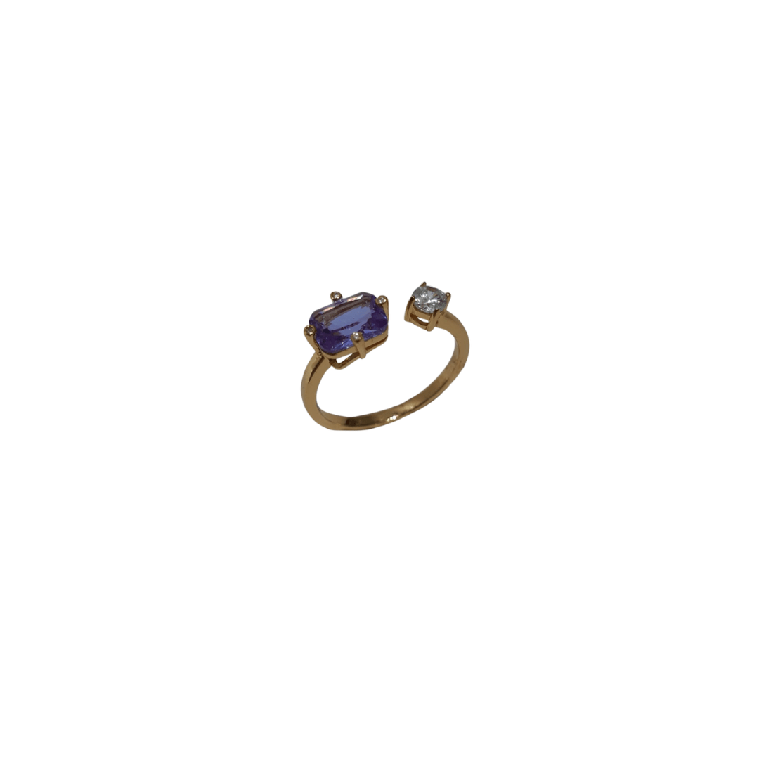 Anillo plata de ley 925 mm con baño de oro 18 kilates, con amatista y cuatro garras con mini circonitas. Una circonita con cuatro garras. Abierta, se adapta a todas las medidas. Anillo precioso y elegante para cualquier ocasión.