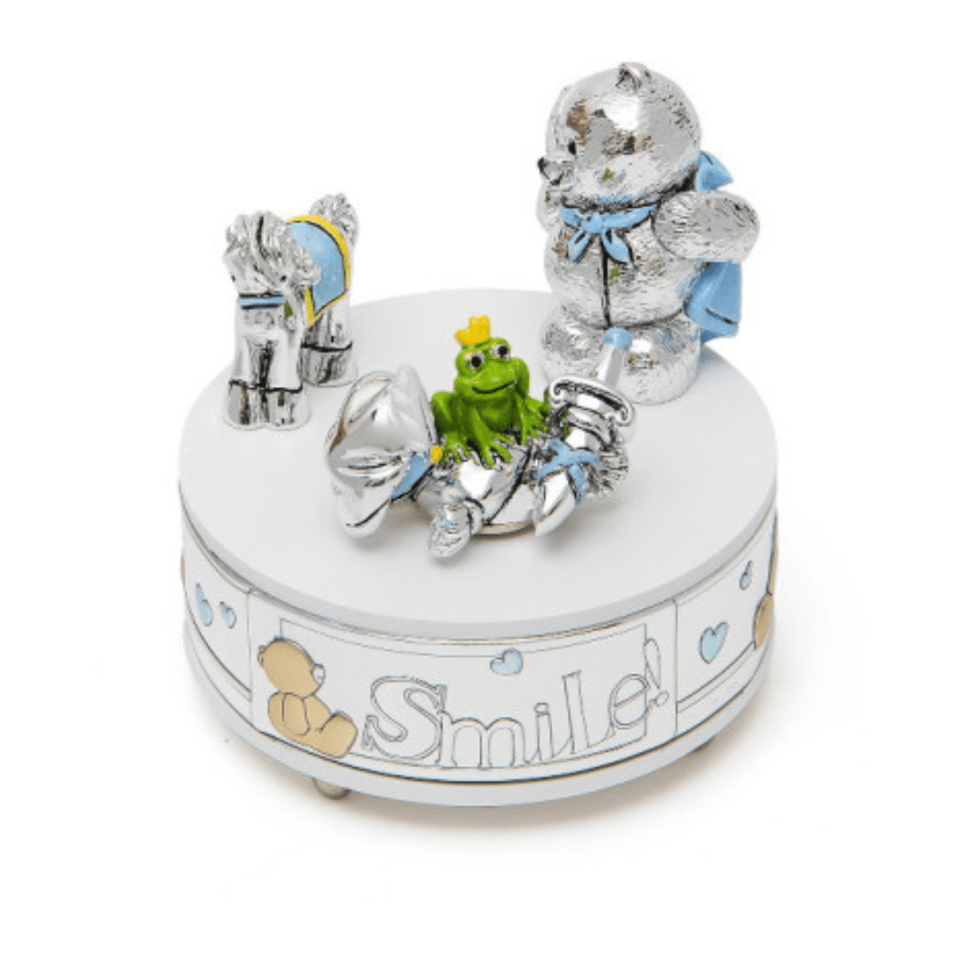 Precioso y dulce carrusel musical de osito aventurero. Con bonitos esmaltes en color azul bebé, verde y amarillo. De la Colección Deluxe este divertido osito te sonríe con su capa de súper héroe . Mide 12,5cm de diámetro. Al darle cuerda, suena una dulce melodía que te hará quitar una sonrisa. Preciosa compañía para la habitación de tu bebé.