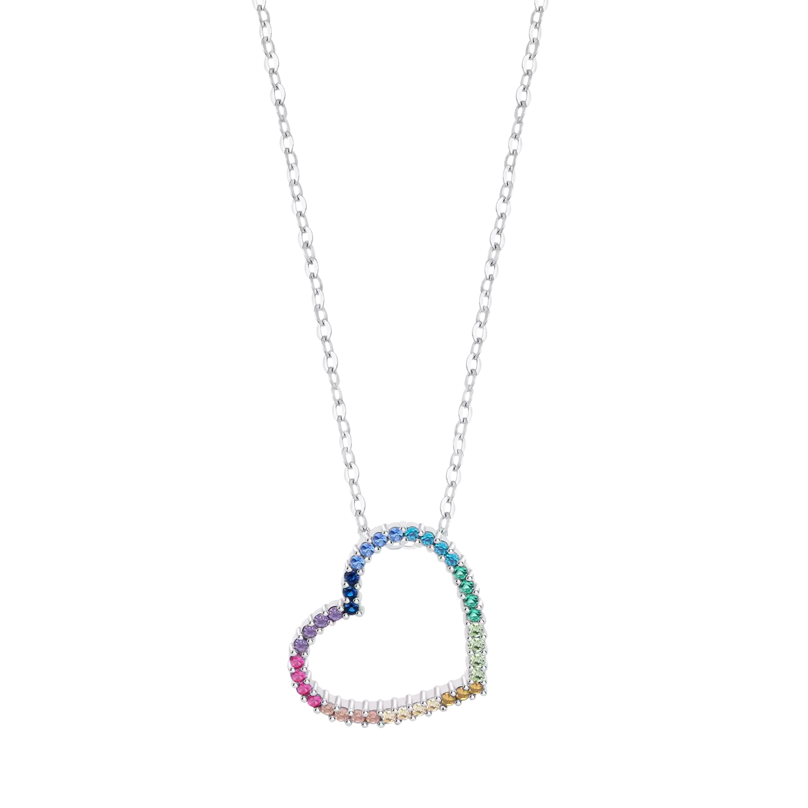 Gargantilla plata de ley 925 mm con baño de rodio y con acabado brillo con colgante en forma corazón de 15mm con circonitas multicolor engastadas. Cadena malla forxat de 42 cm y extensible de 2,5cm. Cierre de áncora.