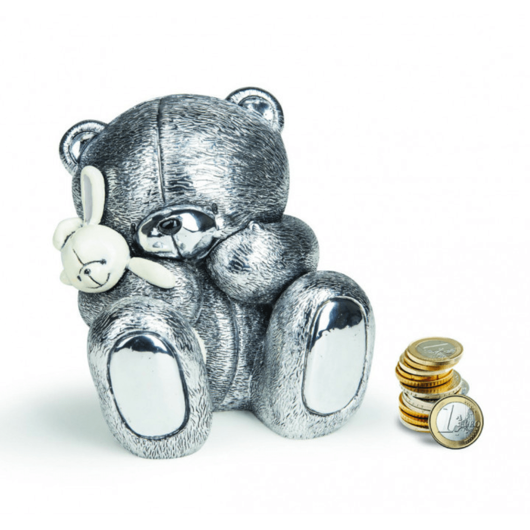 Preciosa y dulce hucha de plata de osito con su fiel amigo el conejito, de la colección Deluxe. El osito tímido y amoroso, juega con su lindo peluche. Mide 14cms.