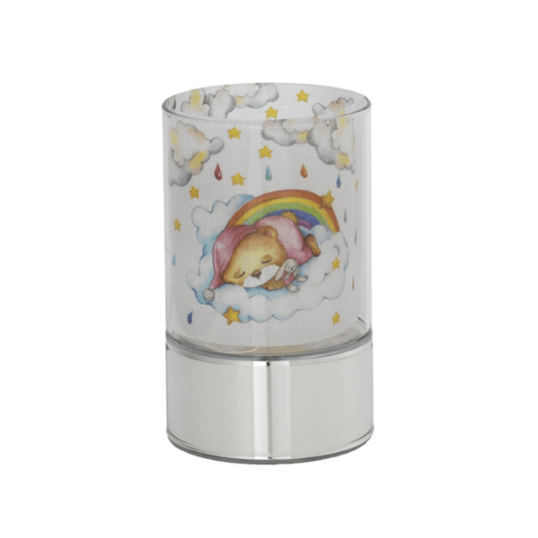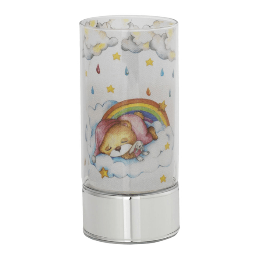 Preciosa lámpara de osito bebé dormilón y arcoiris con pantalla brilli brilli multicolor. Adornado con estrellas, nubes y arco iris. Lleva luces LED. Es una dulce y bonita lámpara, para la habitación de tu bebé.