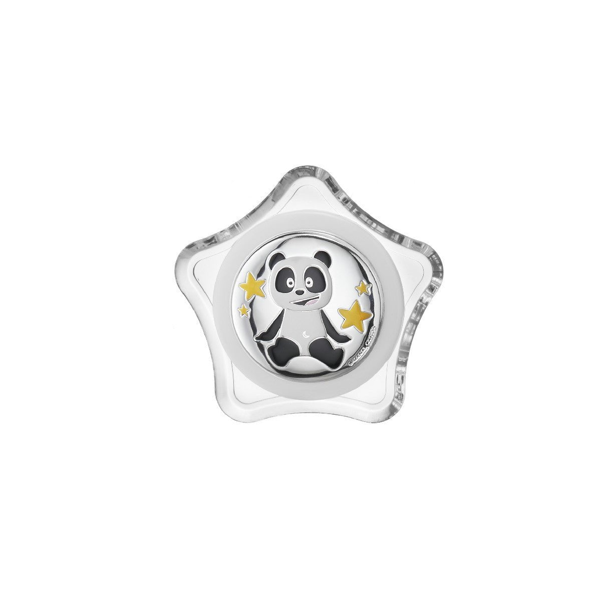 Punto de luz en plata de divertido oso panda y estrellas con esmaltes en color amarillo. Al enchufarla se enciende una lucecita que acompañará las noches de tu bebé. Medida 9*9cm