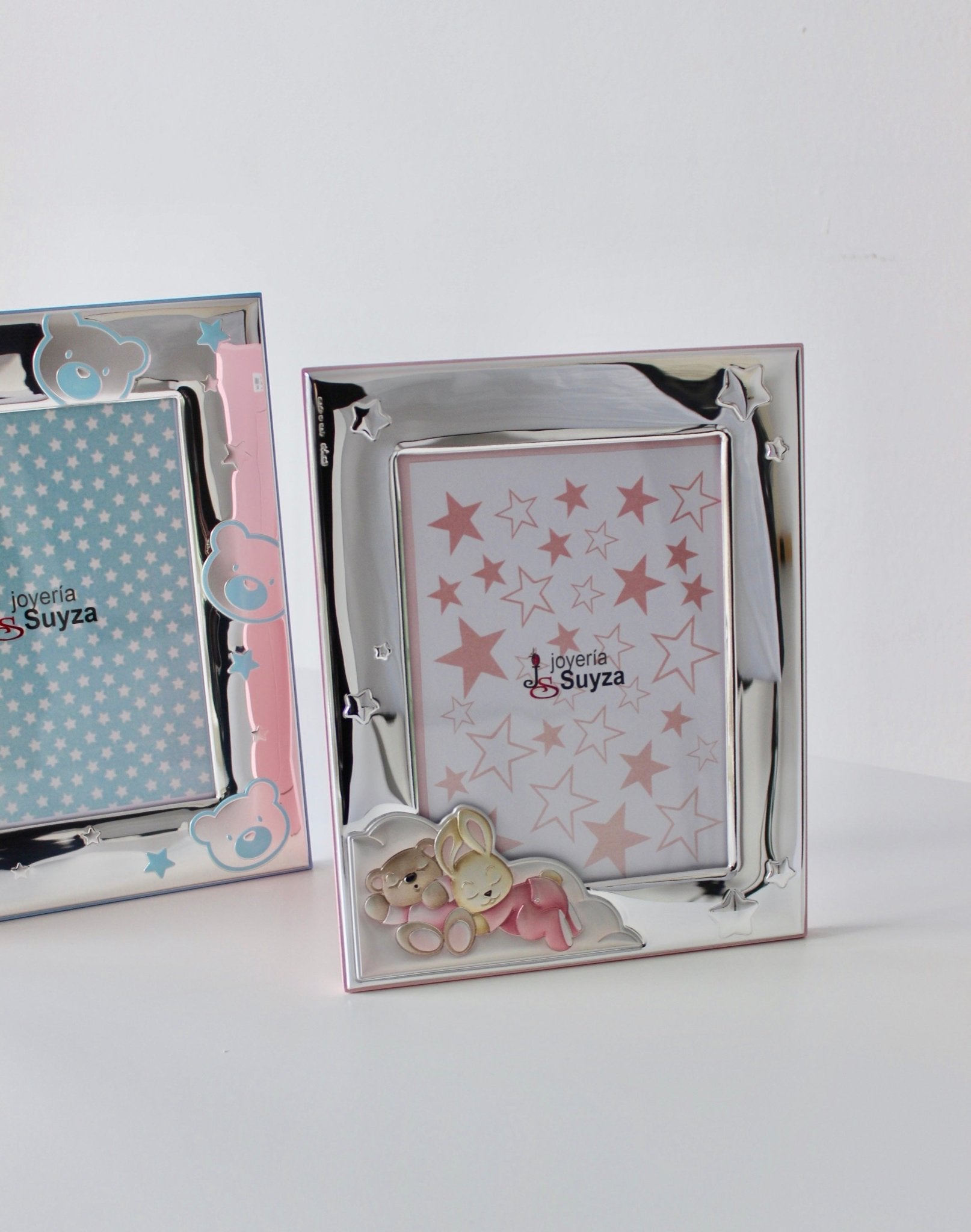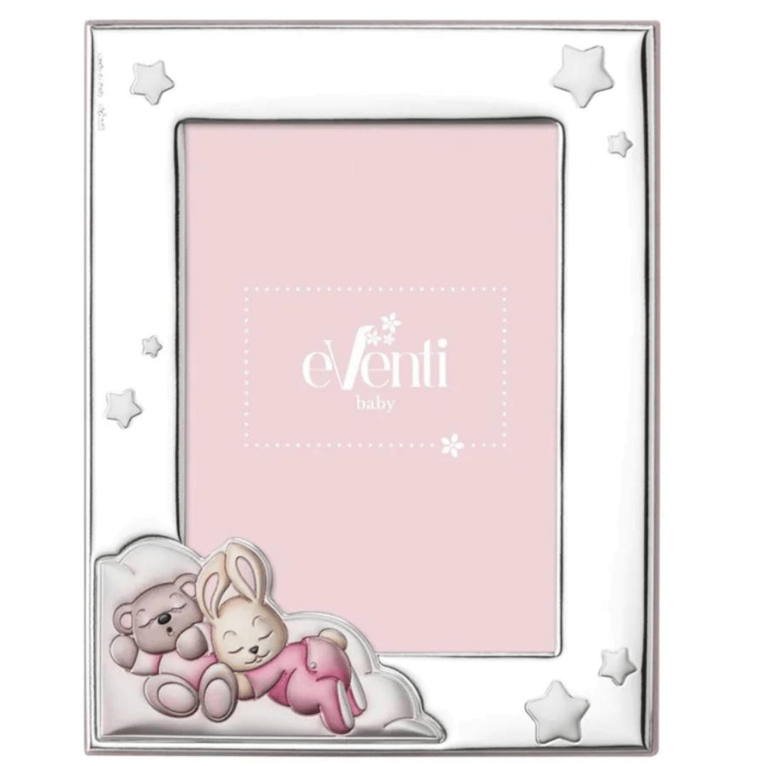 Marco de plata de dulce conejito y osito dormilones esmaltados en tonos rosa y con estrellas brillo. Medida 13x18 cm. Regalo ideal y amoroso para bebé.