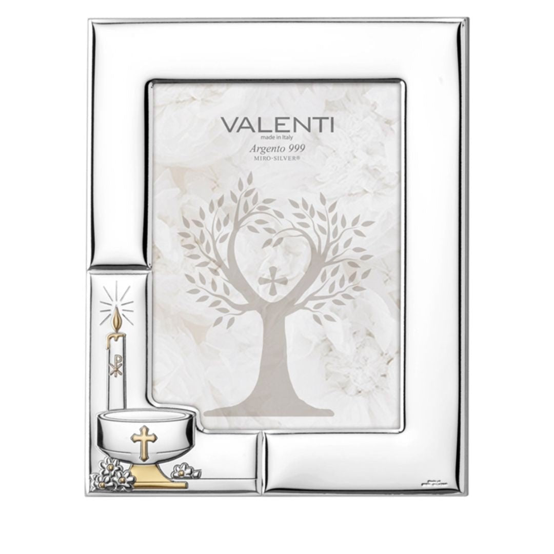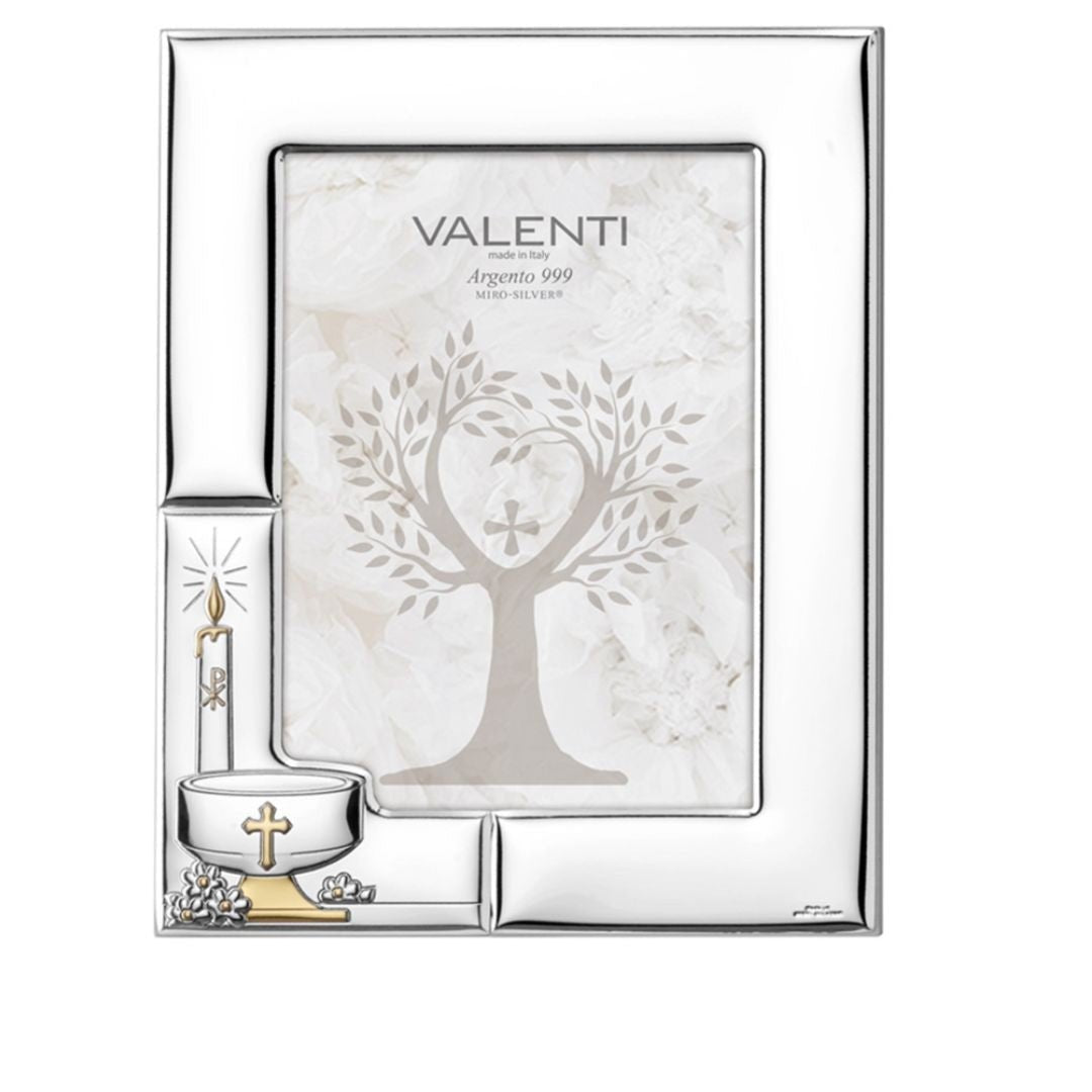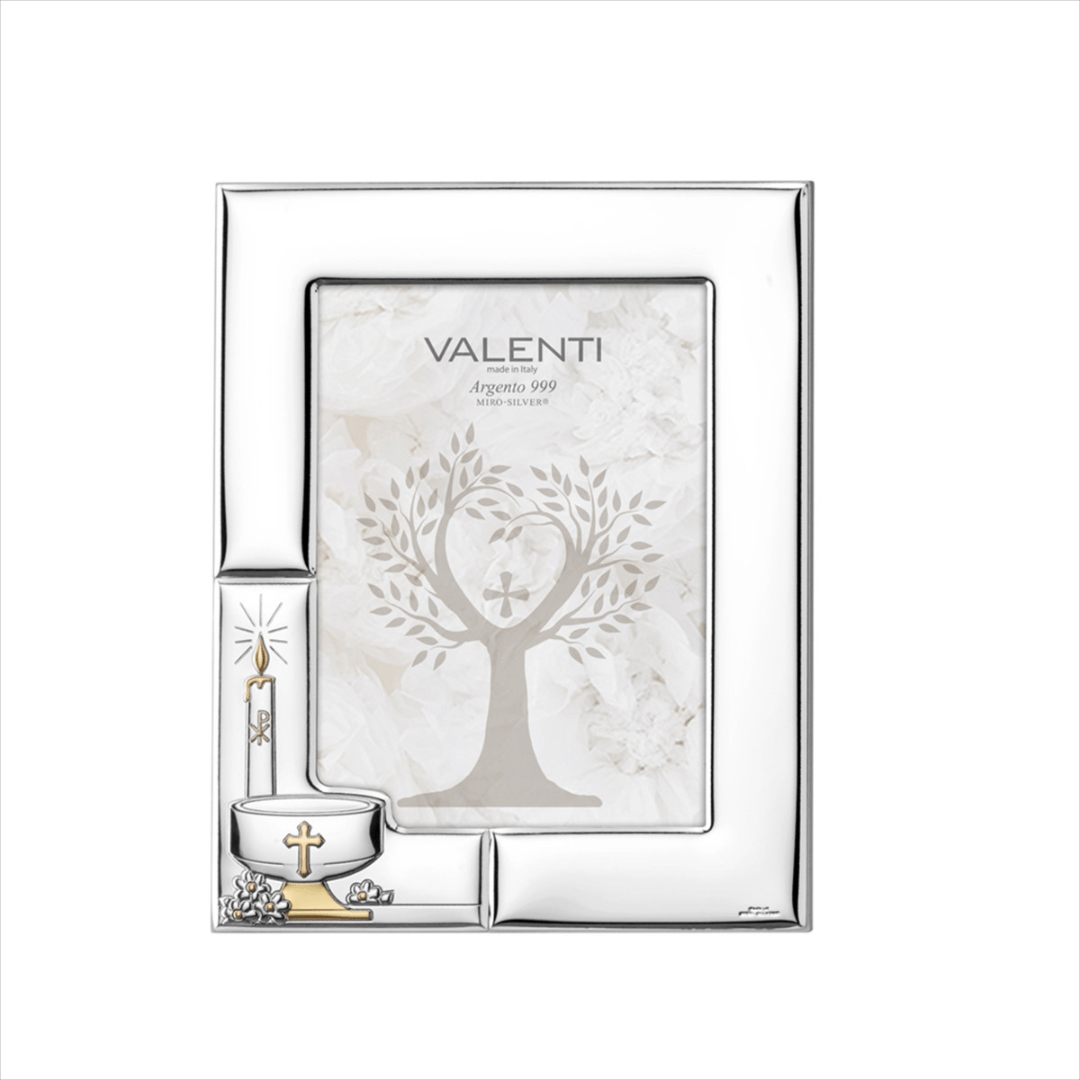 Marco de plata para bautizo con acabado brillo adornado con vela y pila bautismal en brillo y dorado. Medida 13*18 cm