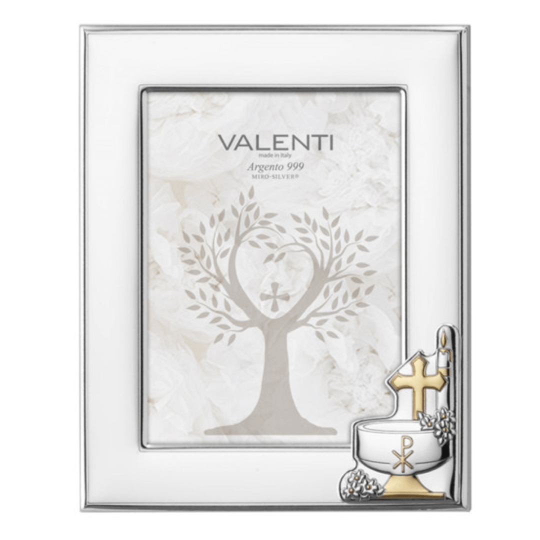 Marco de plata para bautizo con acabado brillo adornado con vela, pila bautismal, cruz y florecillas en brillo y dorado. Medida 13*18 cm