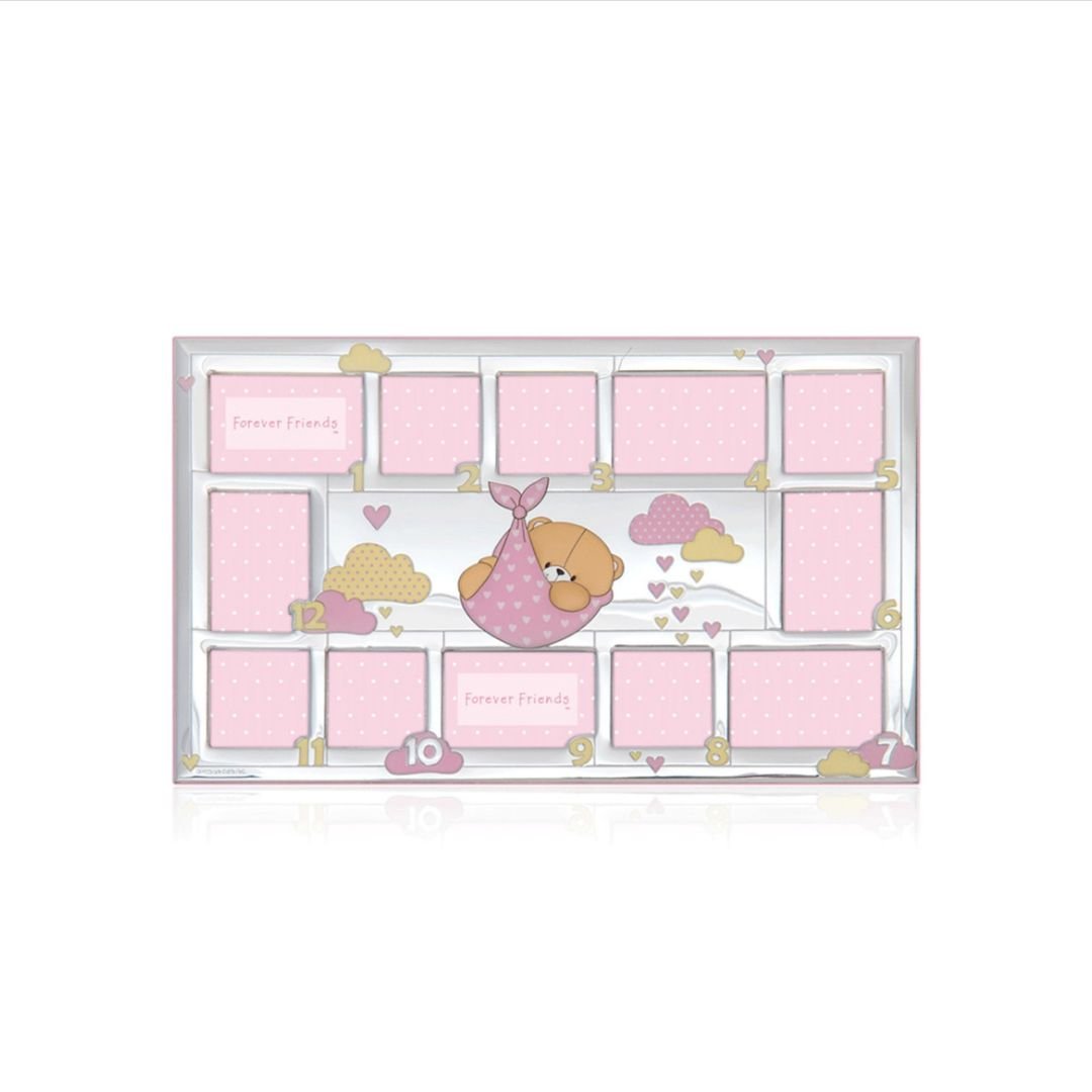 Marco de plata Mi Primer Año con osito amoroso sonriente y esmaltes de colores rosa beige y amarillo en nubes y corazones .Fotos para 12 meses. Medida 31x19 cm ,trasera de madera color rosa bebé. Precioso marco de plata para las fotos tan especiales que adornará la habitación de tu bebecita.