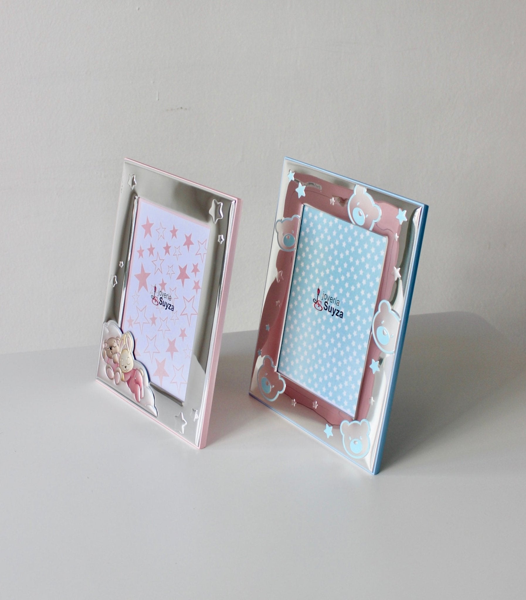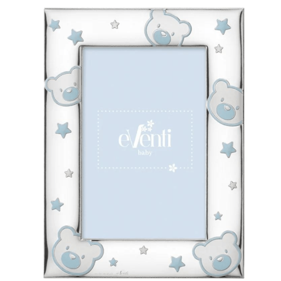 Marco de plata con caritas de osito y estrellas esmaltadas en color azul cielo bebé. Medida 13x18 cm. Regalo ideal para el bebé.