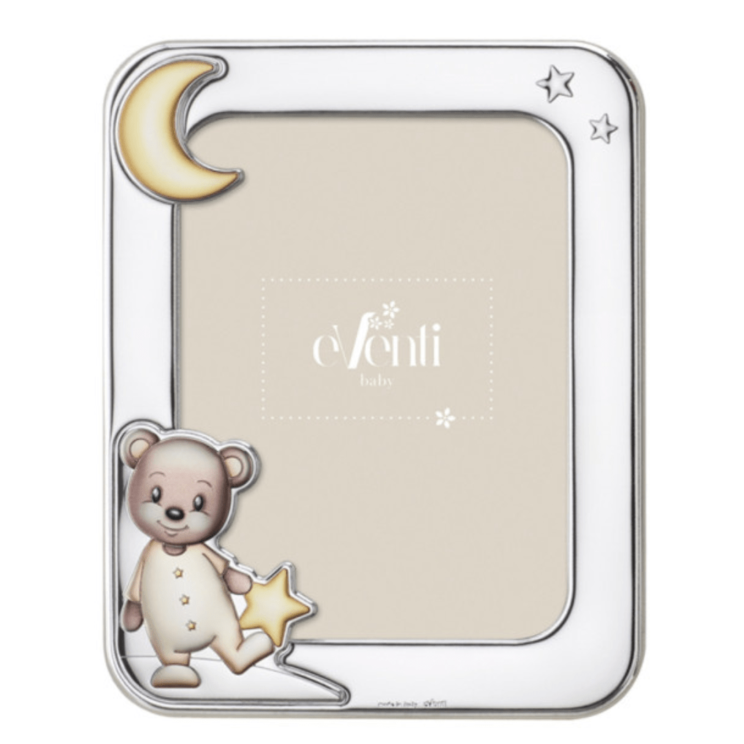 Precioso y dulce marco de plata de osito con con pijama y estrella en tonos beige y dorado con estrellitas y luna. Su medida es de 15*20 cm y su trasera es de madera beige-blanca.