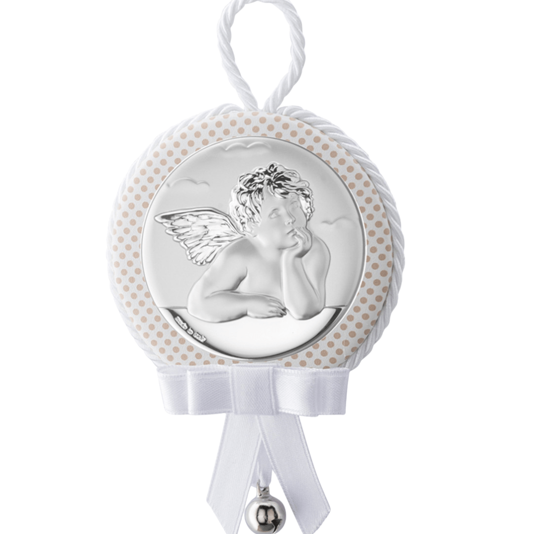 Para ese ser querido este regalo dulce y especial. Este hermoso medallón musical para la cunita o el carrito del bebé del tierno ángel de Rafael. En plata, con acabado en polipiel suave y la melodía de un mini cascabel. Un obsequio que le dará protección al bebé y además, su dulce melodía le relajará.
