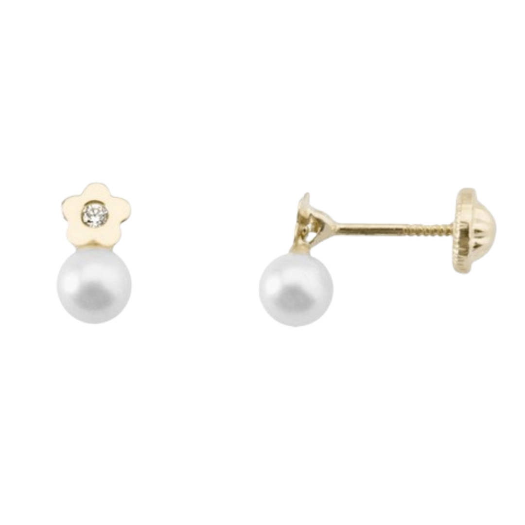 Estos pendientes de oro son el regalo ideal para cualquier ocasión. Con un hermoso diseño de flor con circonita y perla, harán sentir a tu niña especial y elegante. ¡Dale un toque de brillo a su look con estos pendientes! Y a ti mami, también te encantarán.