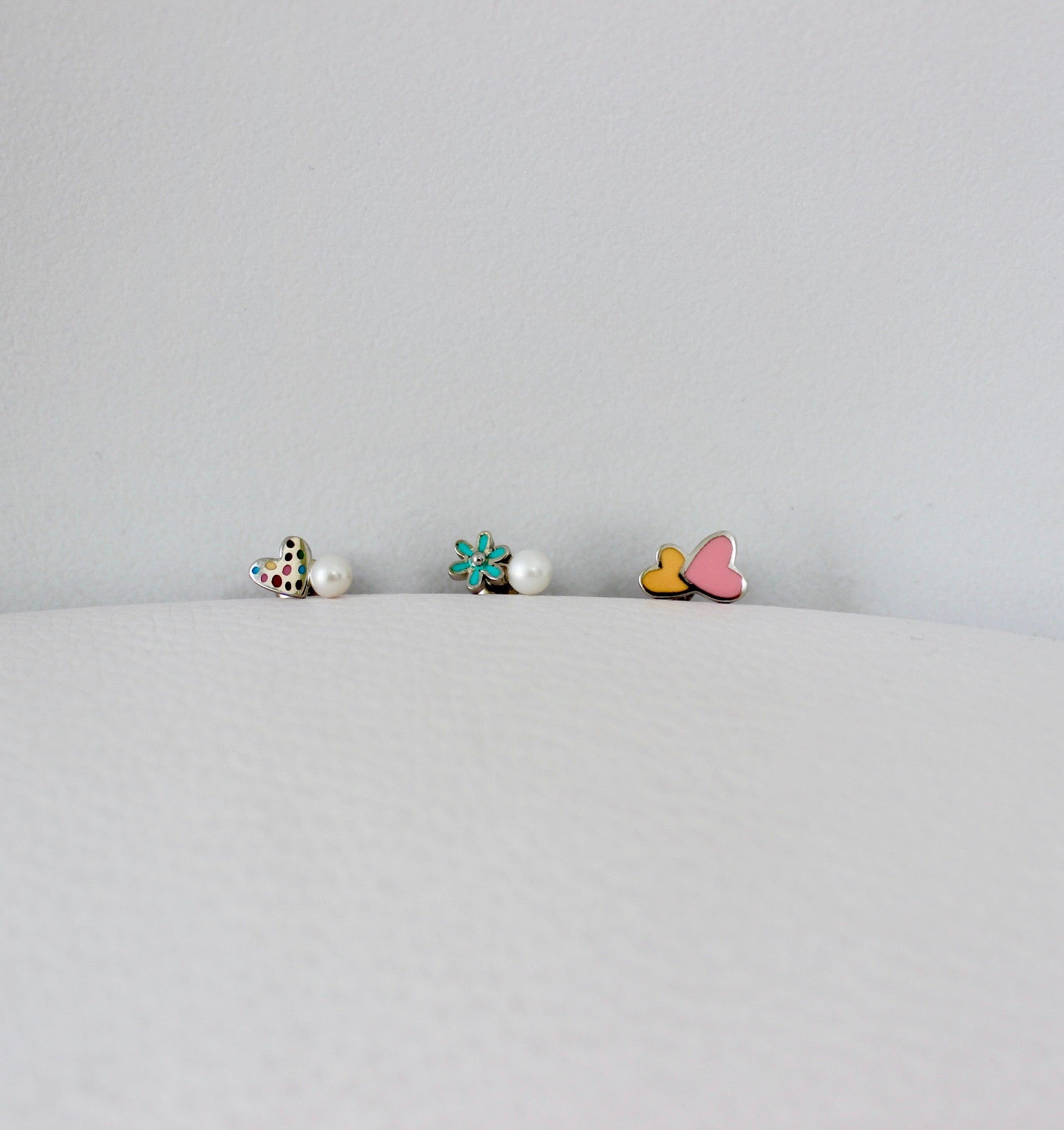 Pendientes plata de ley 925 mm perla cultivada de 4 mm ¨Tu y Yo¨ adornada con un divertido corazón esmaltado en múltiples colores, rojo, rosa, azul, verde y amarillo. Lleva cierre de rosca, ideal para tu peque.