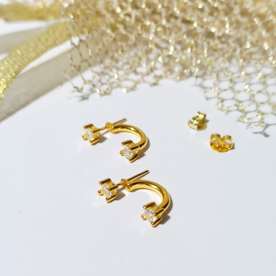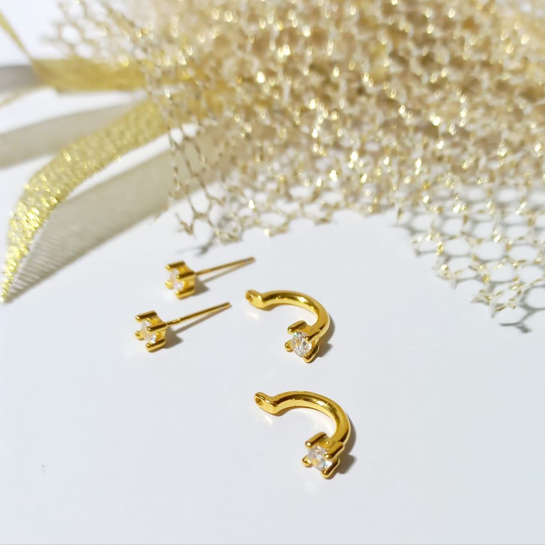 Te encantarán estos pendientes de plata con baño de oro de 18Kt. Son tan divertidos, modernos y atrevidos que cuando te los veas puestos te encantarán. Un para de pendientes modelo dormilona con cuatro garras que podrás poner solos o le podrás añadir el aro y se verá monísimo. ¡Atrévete, porque te aseguro que te enamorarás de ellos !