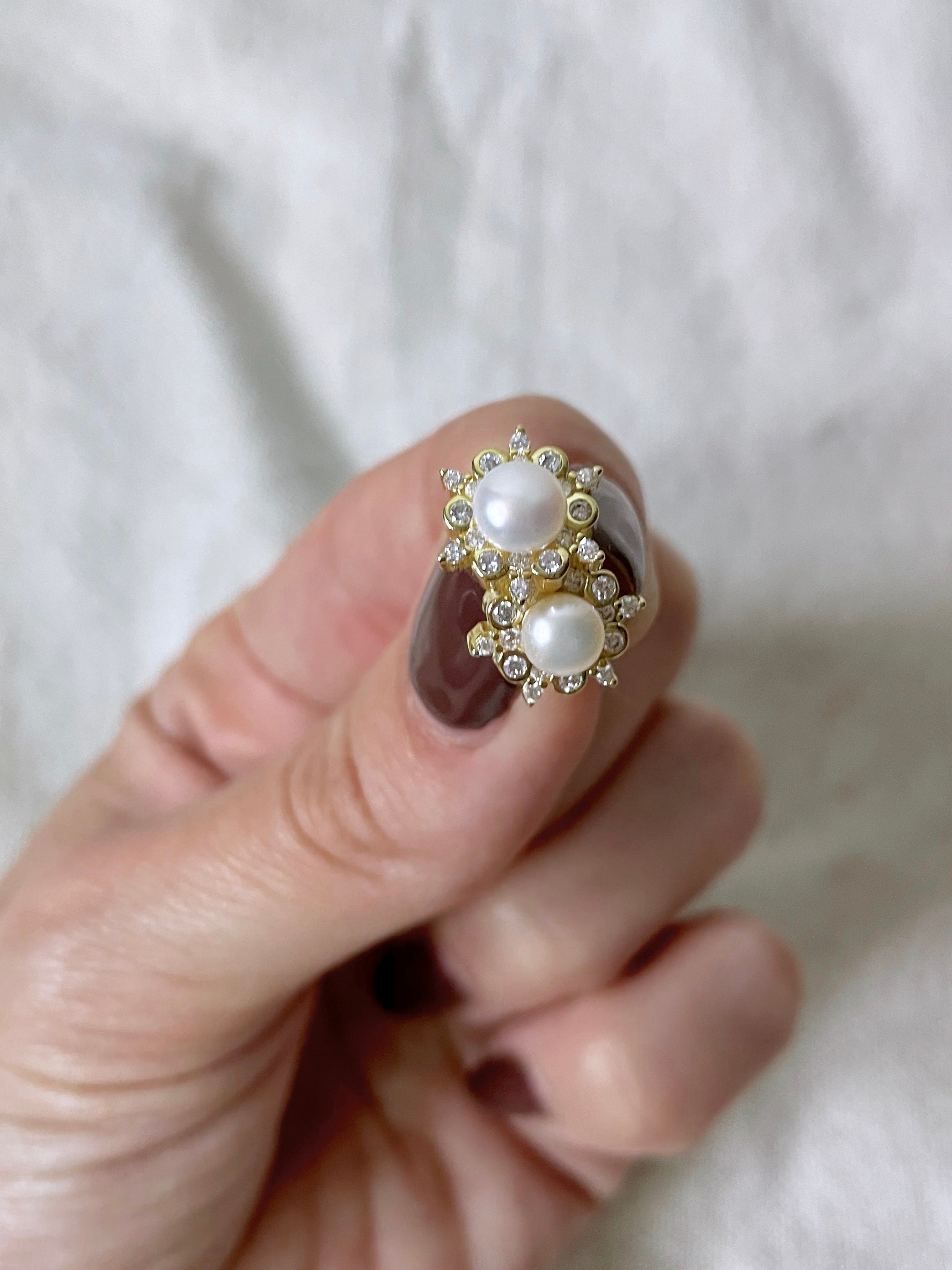 Pendientes de plata 925mm con baño de oro 18Kt. Roseta de circonitas con garras en forma de estrella-flor con perla de río cultivada. Mide 11 mm y lleva cierre de presión.