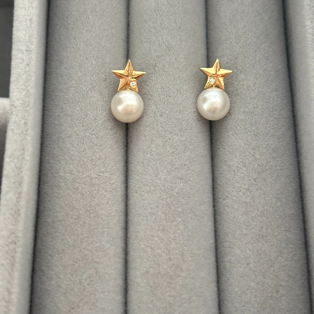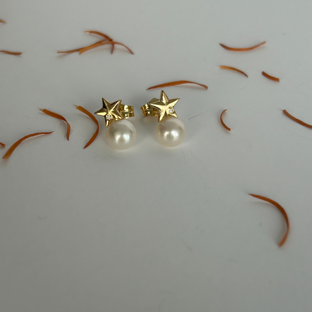 Pendientes de oro amarillo 18k con perla cultivada de 6 mm y estrella con diamante natural de 0,008 ct. Cierre de presión seguro.